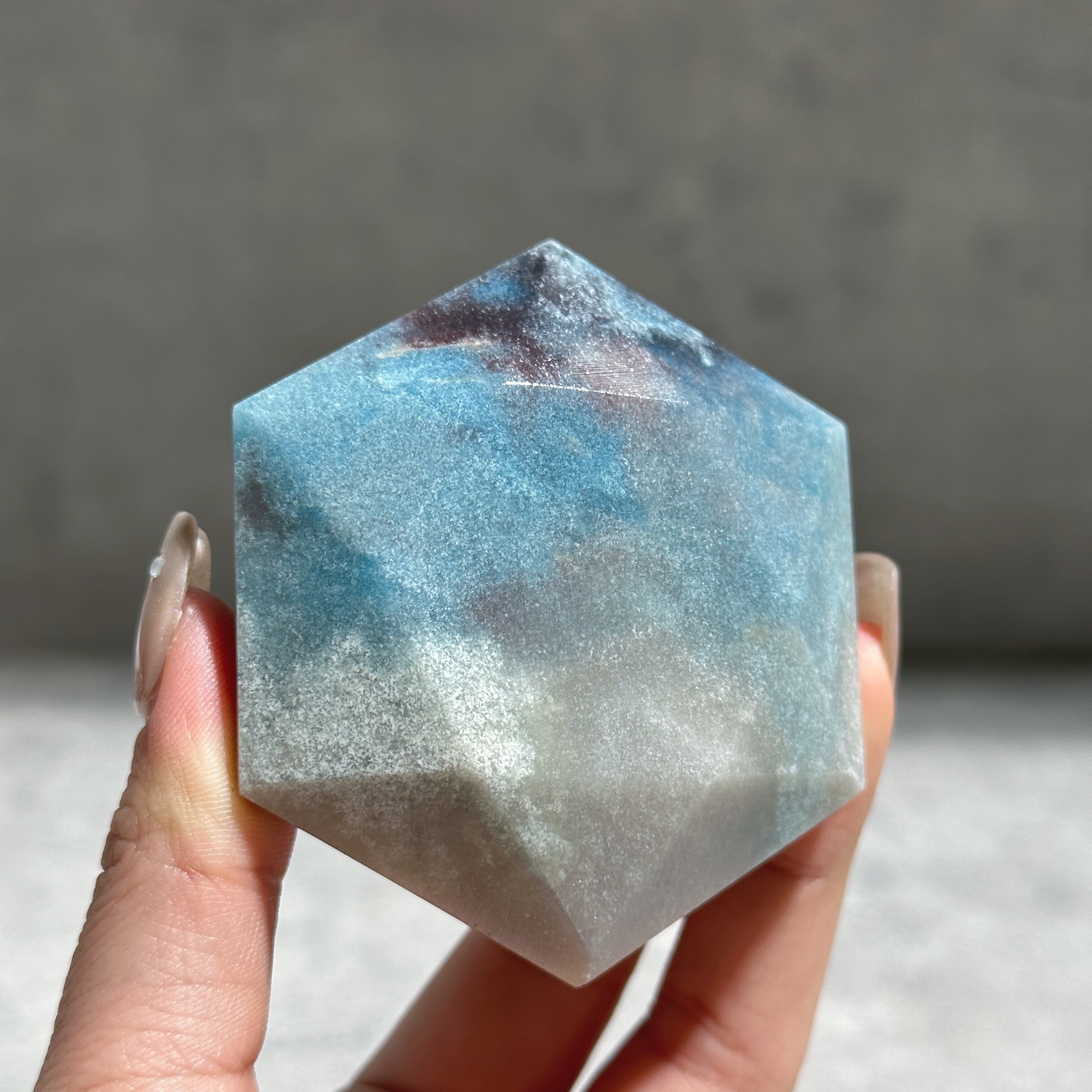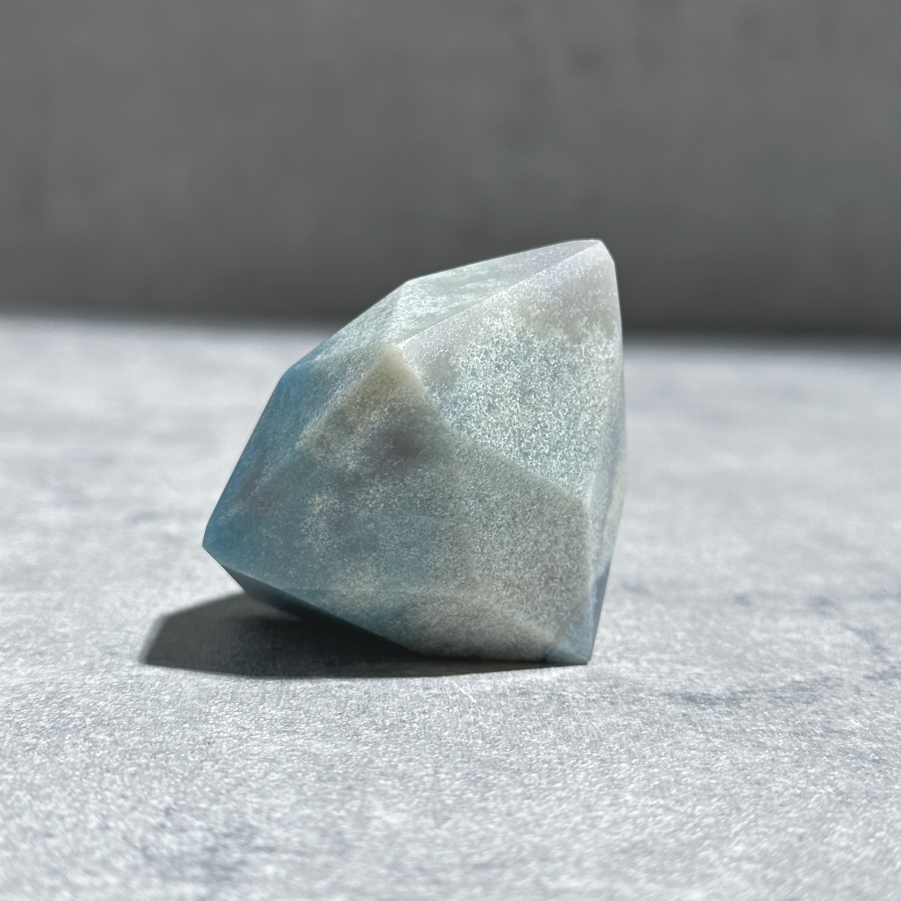 ここでは「トロレアイト」と呼びますが、トロレアイト(青)・クォーツ(白)・ラズライト(濃い青)が混じったもののようで、曲線を描くグラデーションと引き込まれるような色合いを持つ鉱物です。面によって異なる表情を見せる、世界に二つとないお品です。