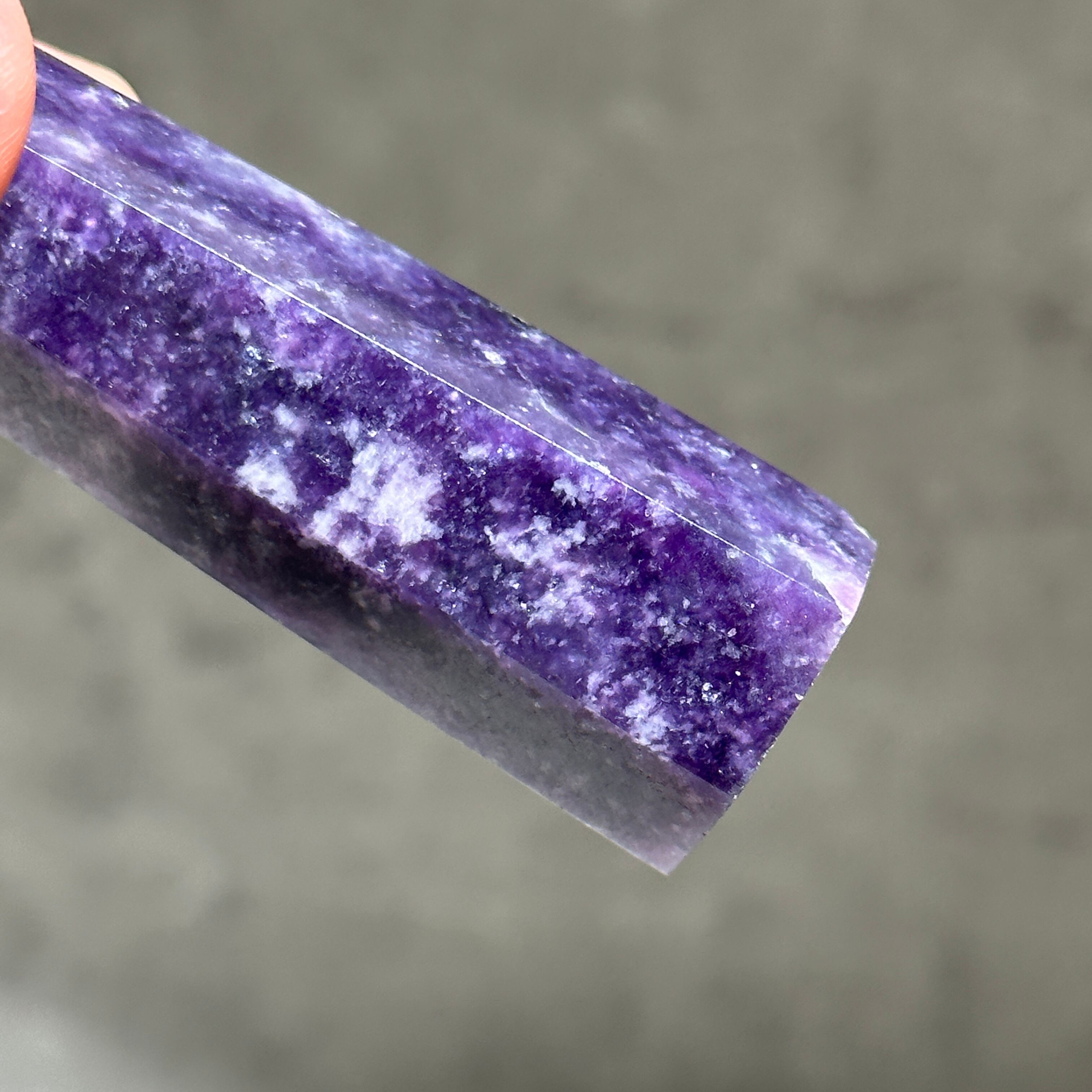 パープル色の鉱石、レピドライトの原石をタワー型に研磨しました。