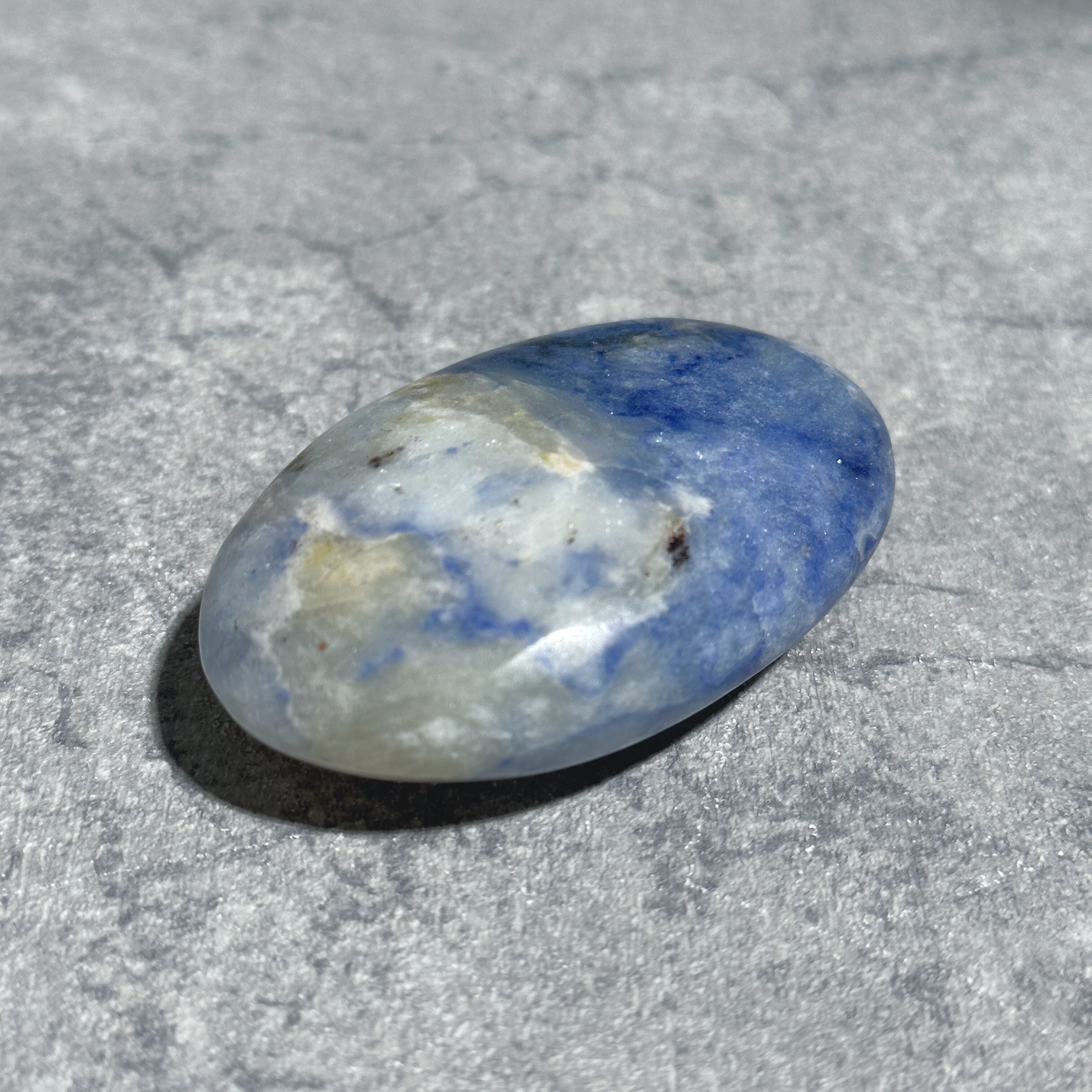ご紹介のパームは、白をベースに青が部分的に混ざり合い優しい色合いを生み出しています。群青色とも言えるブルーは硫黄に由来し、白は母岩に含まれる別鉱物や不純物の色。
