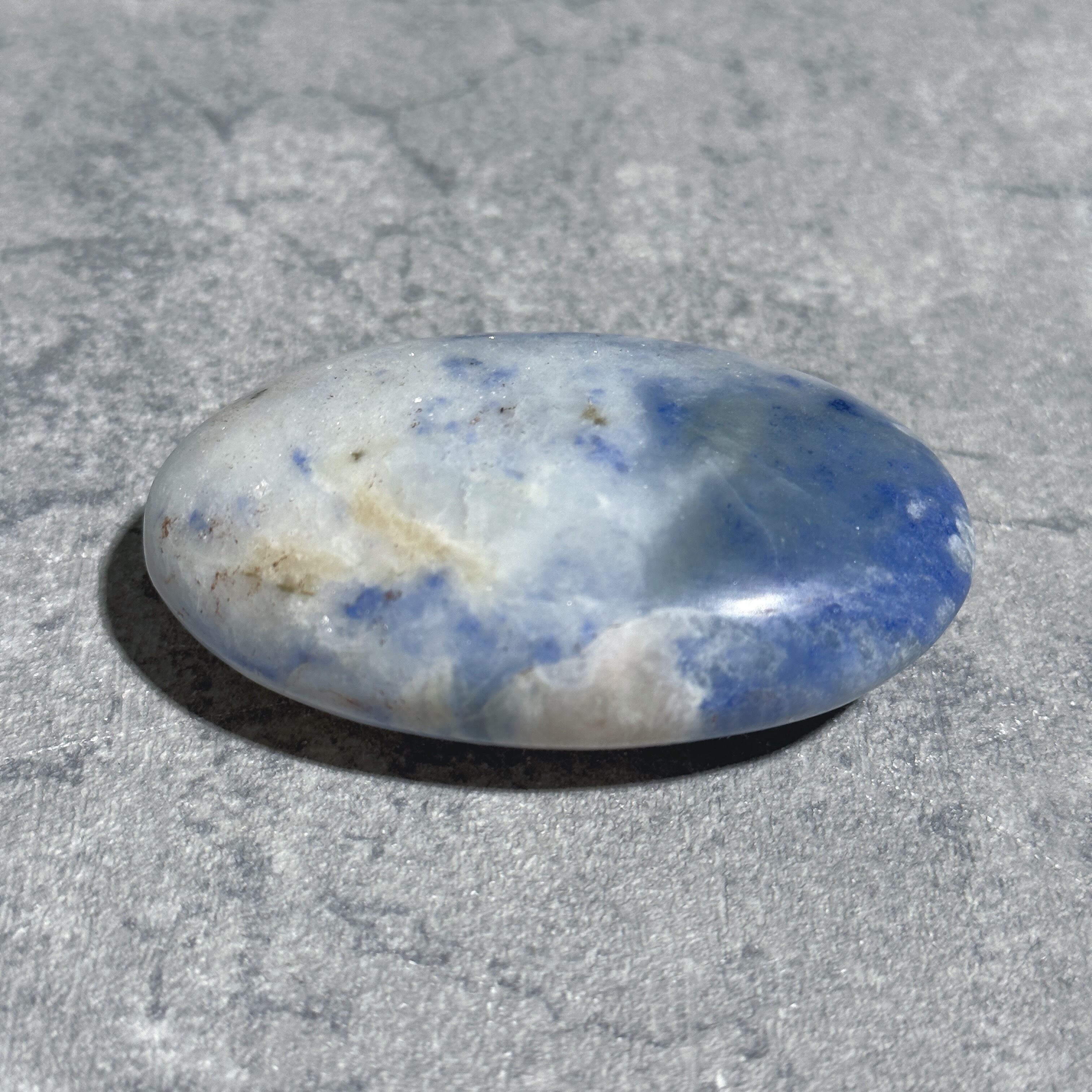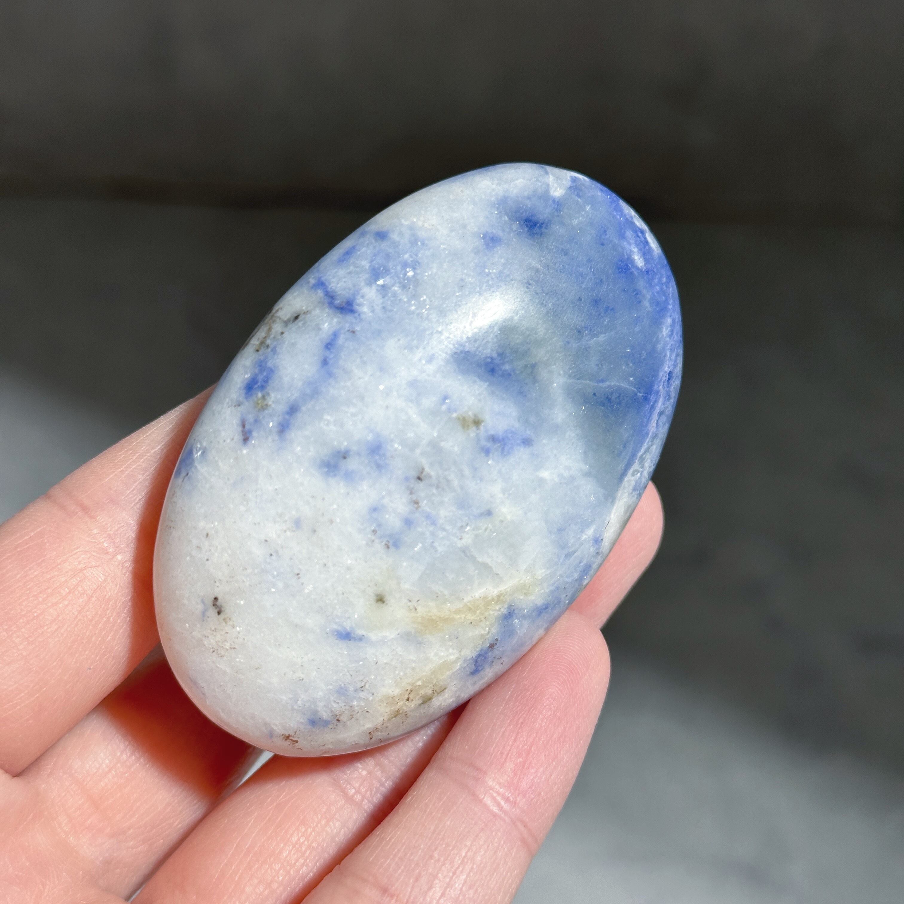 ご紹介のパームは、白をベースに青が部分的に混ざり合い優しい色合いを生み出しています。群青色とも言えるブルーは硫黄に由来し、白は母岩に含まれる別鉱物や不純物の色。