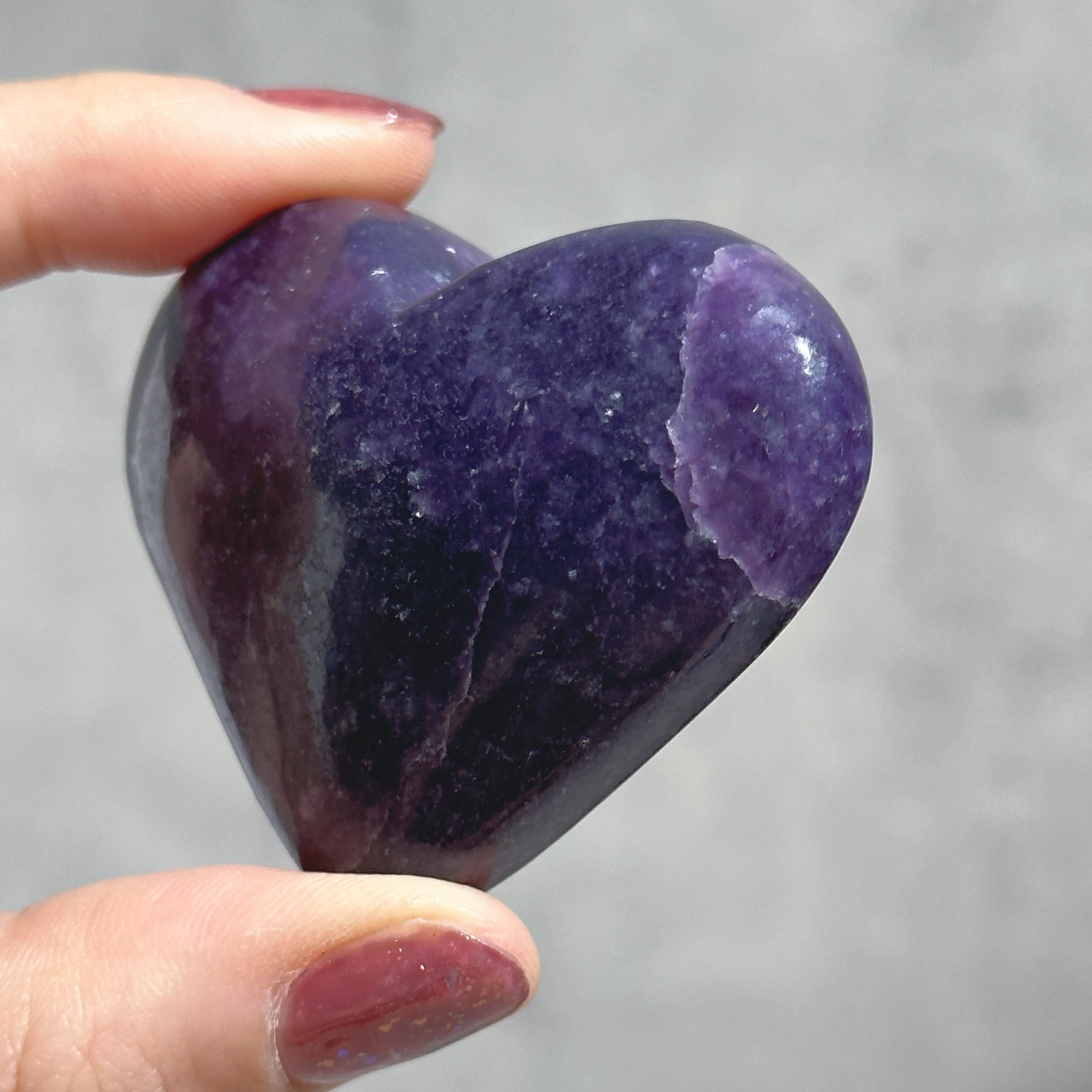 パープル色の鉱石、レピドライトの原石をハート型に研磨しました。