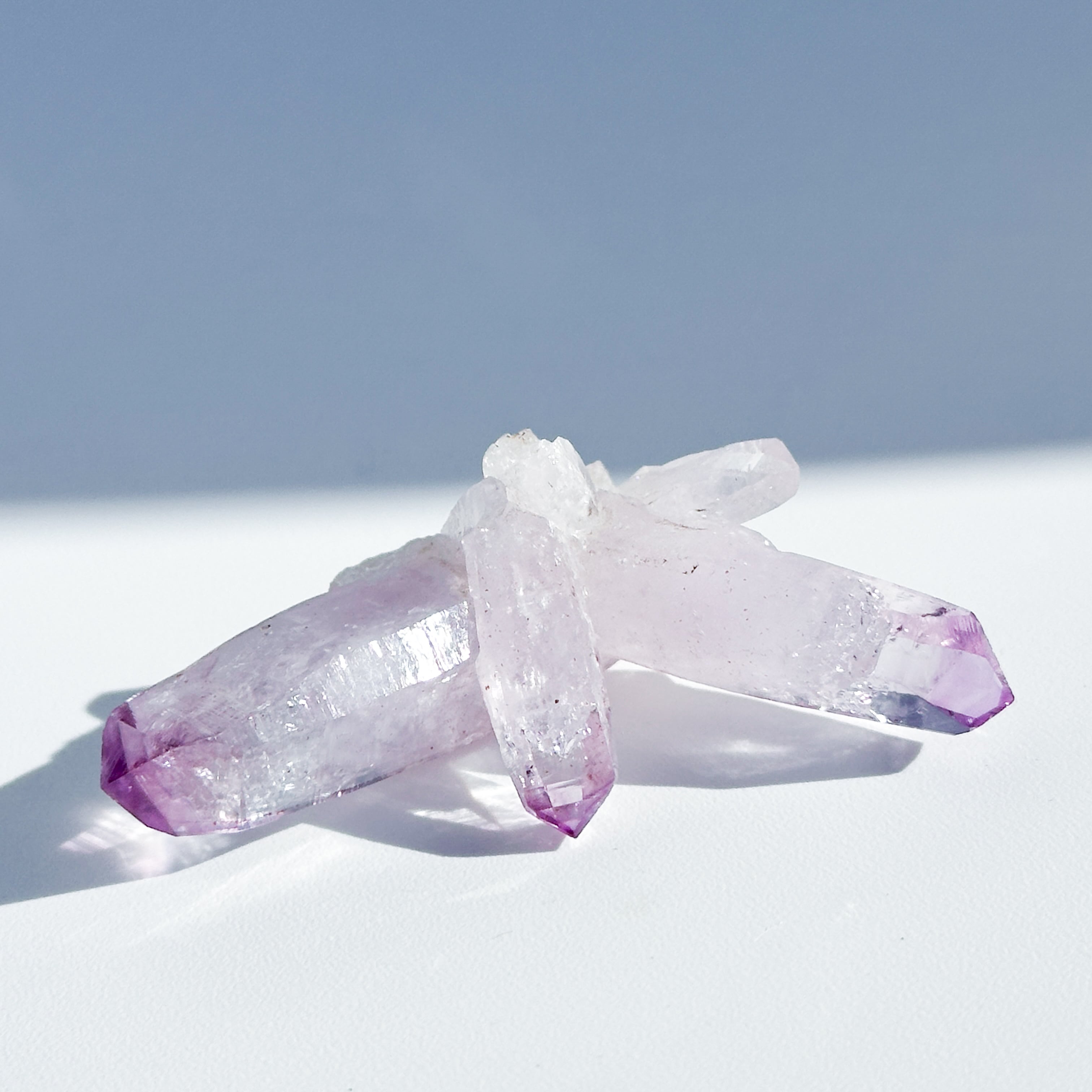 結晶のサイドには成長線(レムリアンレッジ)がくっきりとみられ、