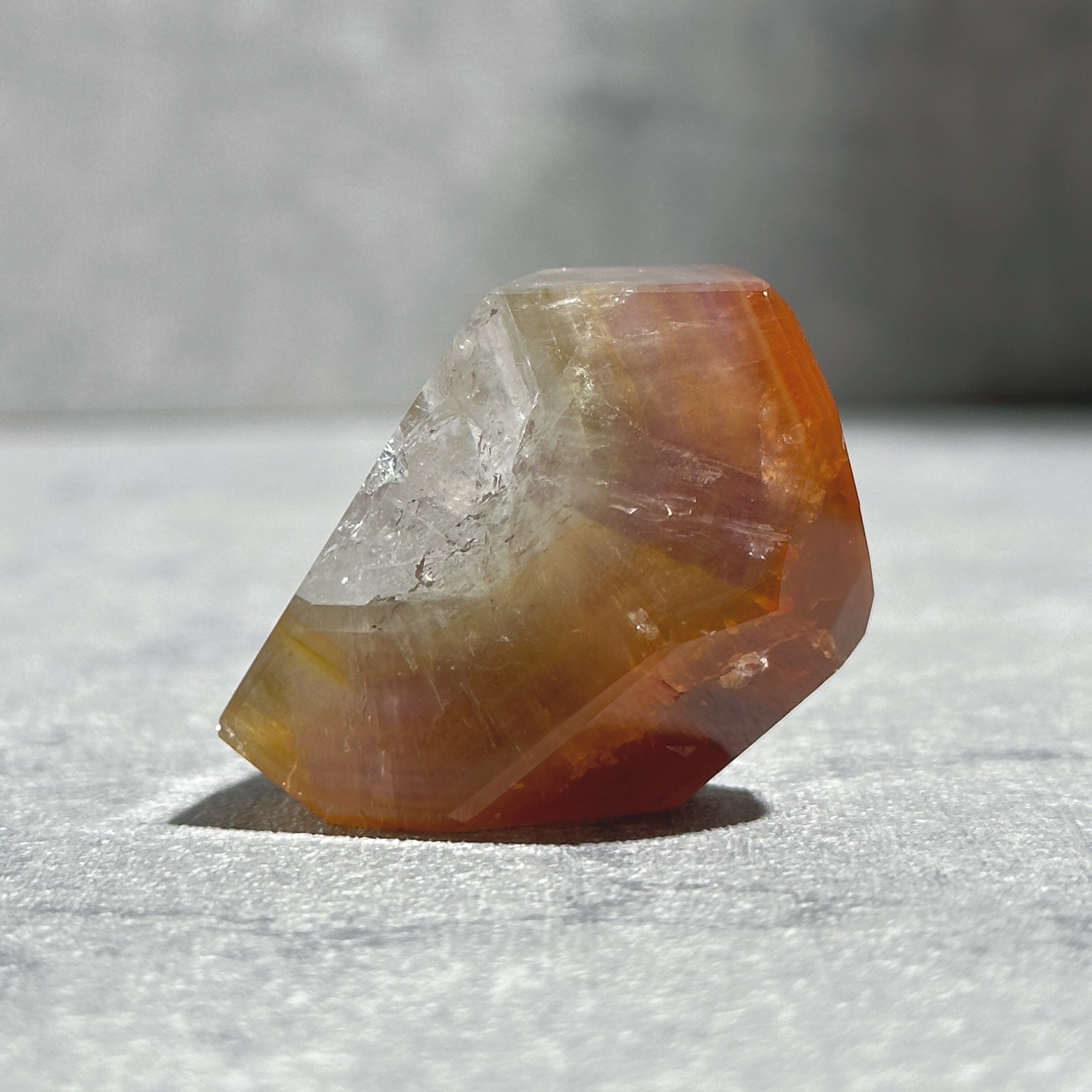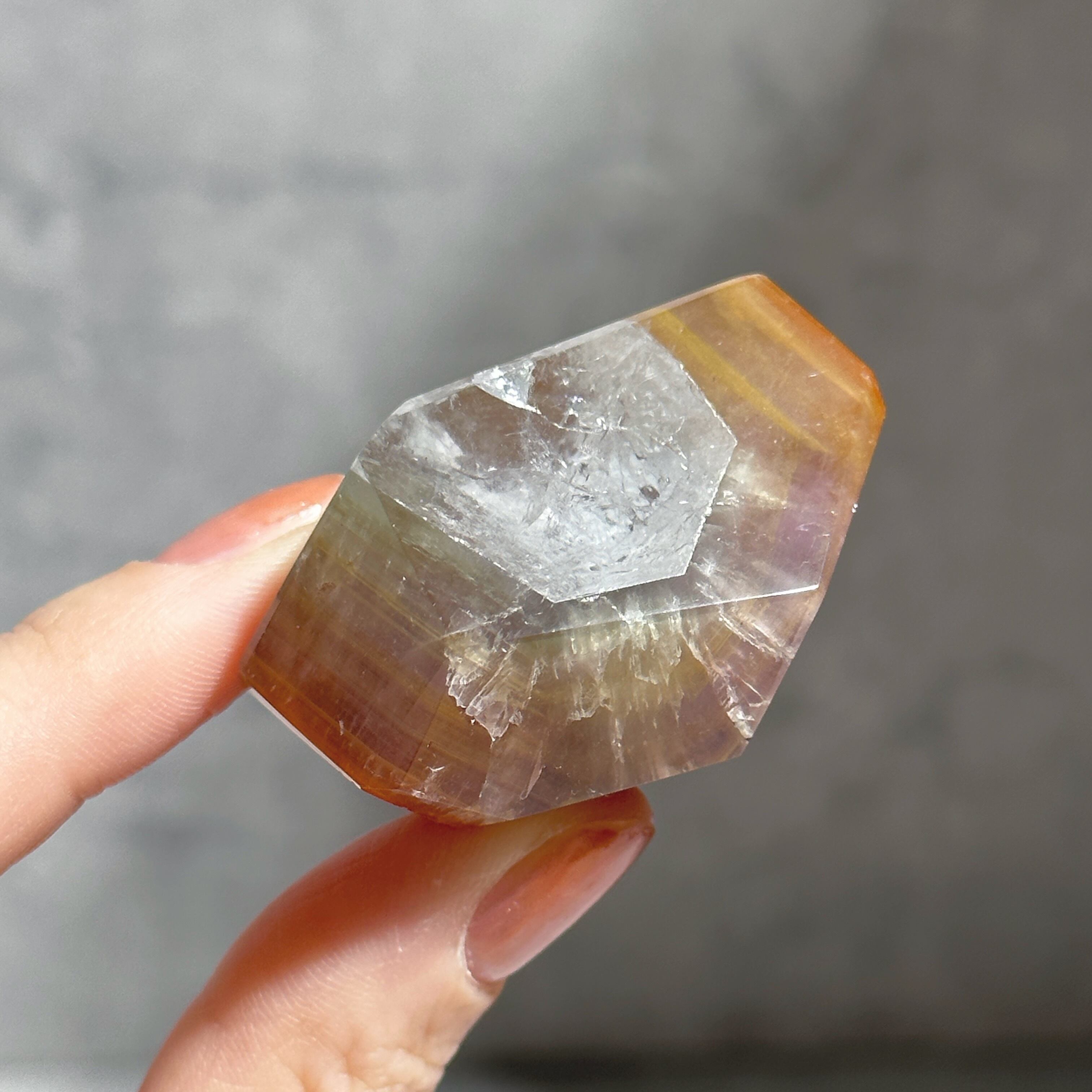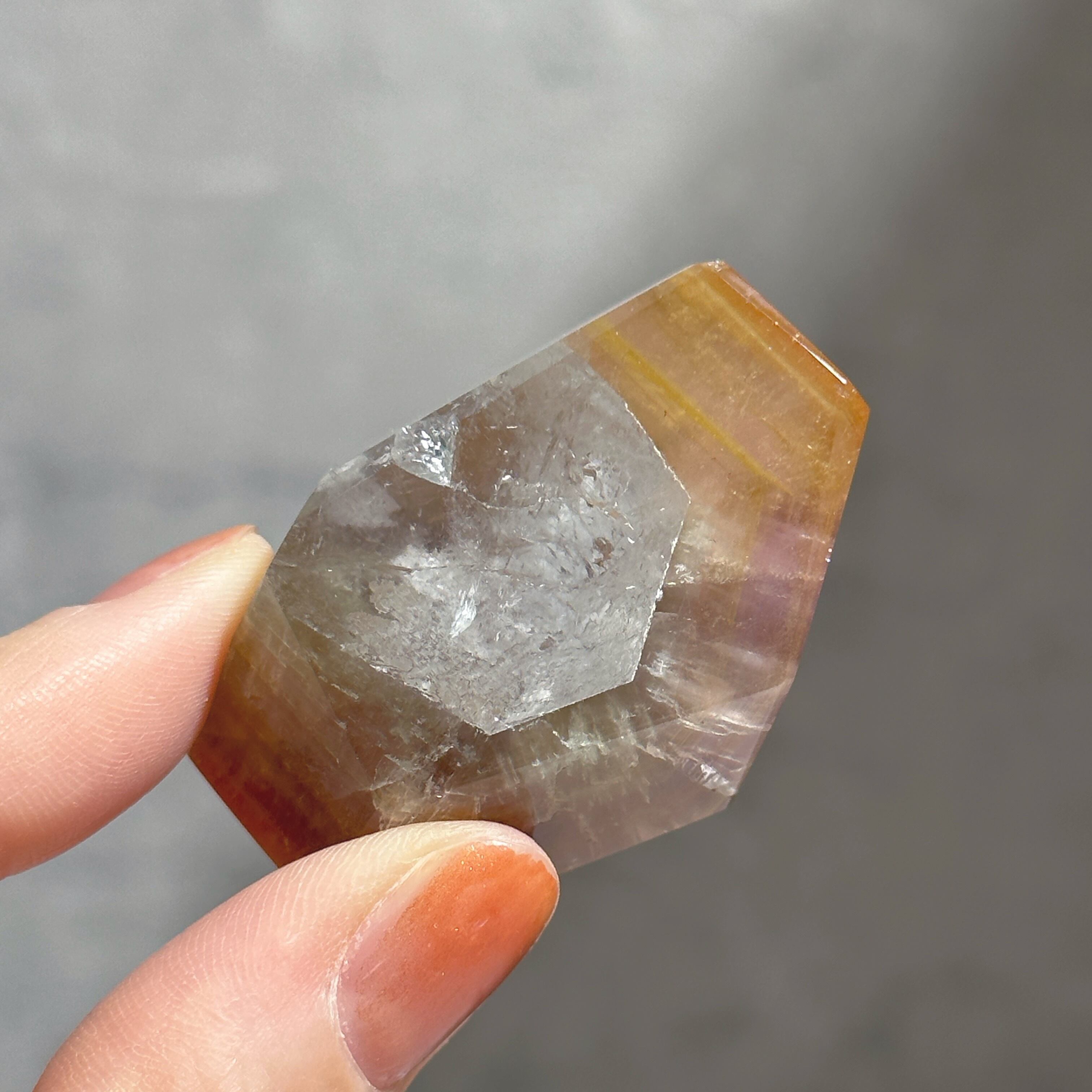 オレンジに色付いた部分は、水晶の表面にヘマタイトなどの鉄分を含んだタンジェリンクォーツと呼ばれるもので、トップにはアメジストが帽子のようにコーティングされています。