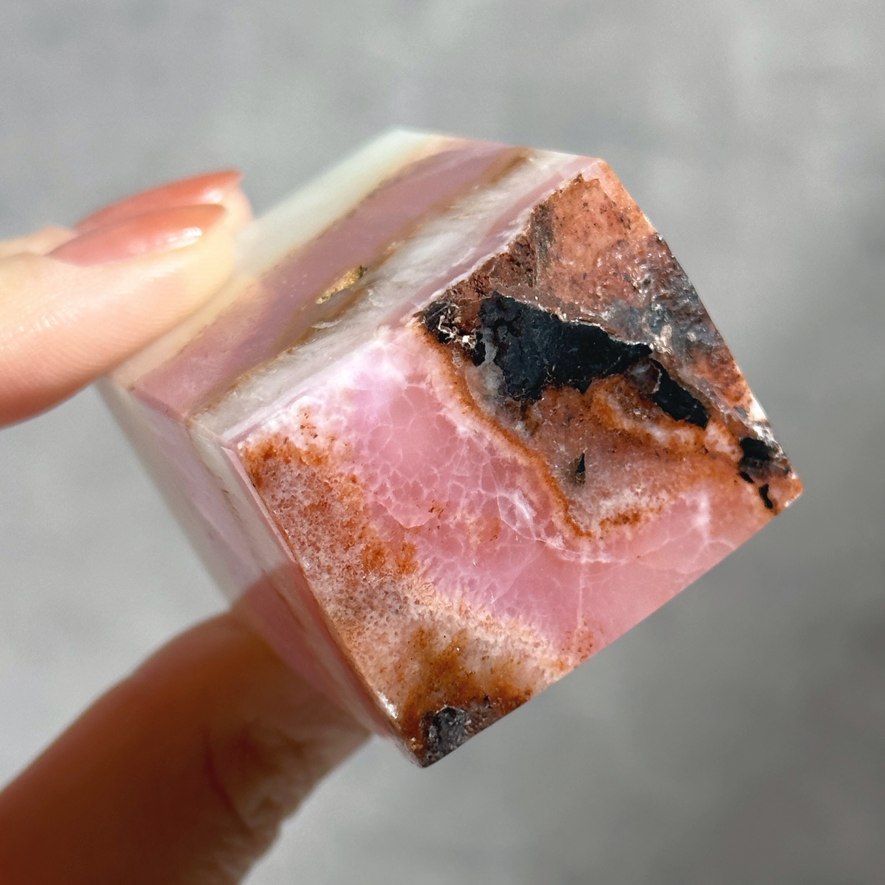 白色の部分も同じアラゴナイトです。アラゴナイト自体は世界中で産出する石ですが、このように、白とピンクが混じったものは、最近パキスタンで採掘されるようになったようで、他に類を見ない非常に珍しいものです✧