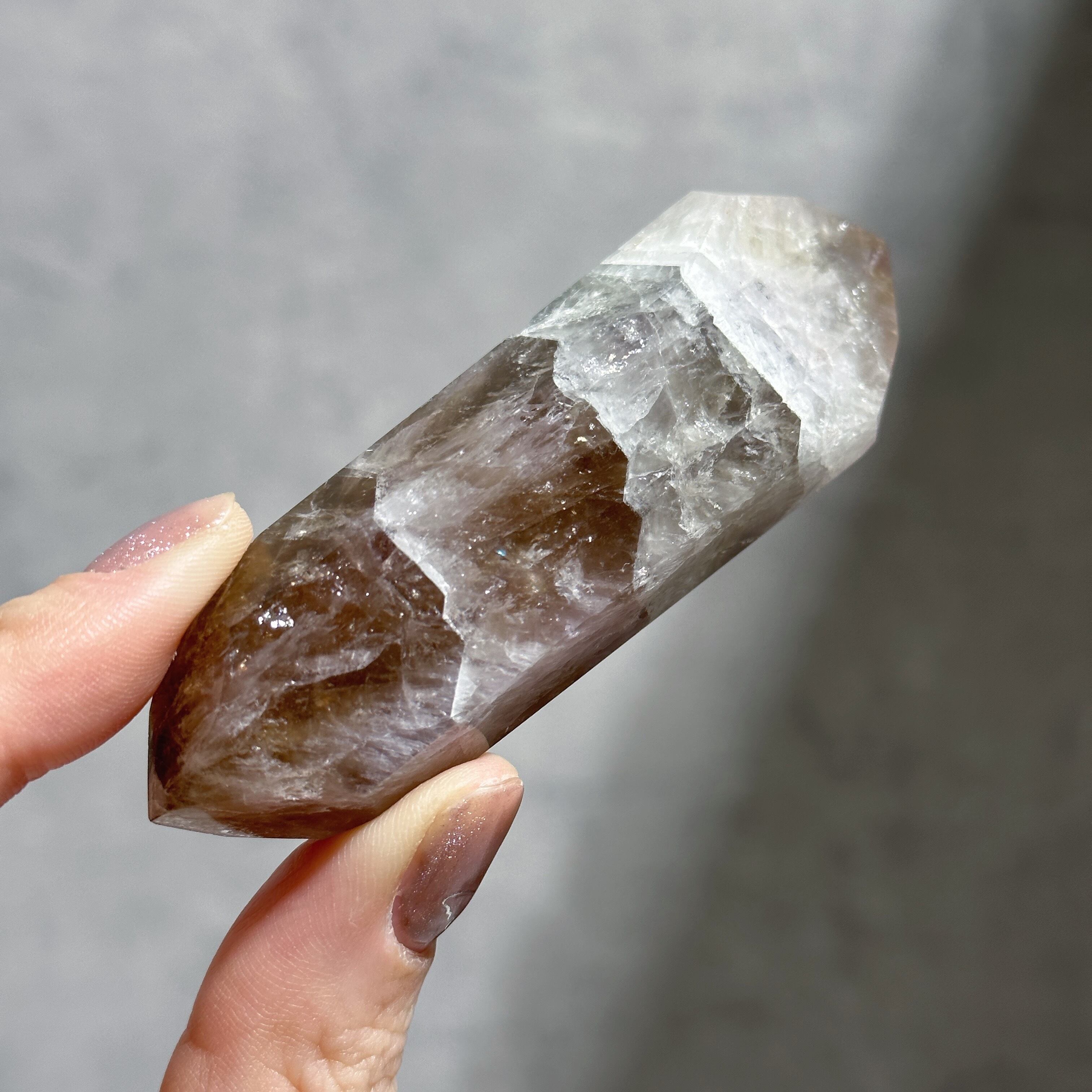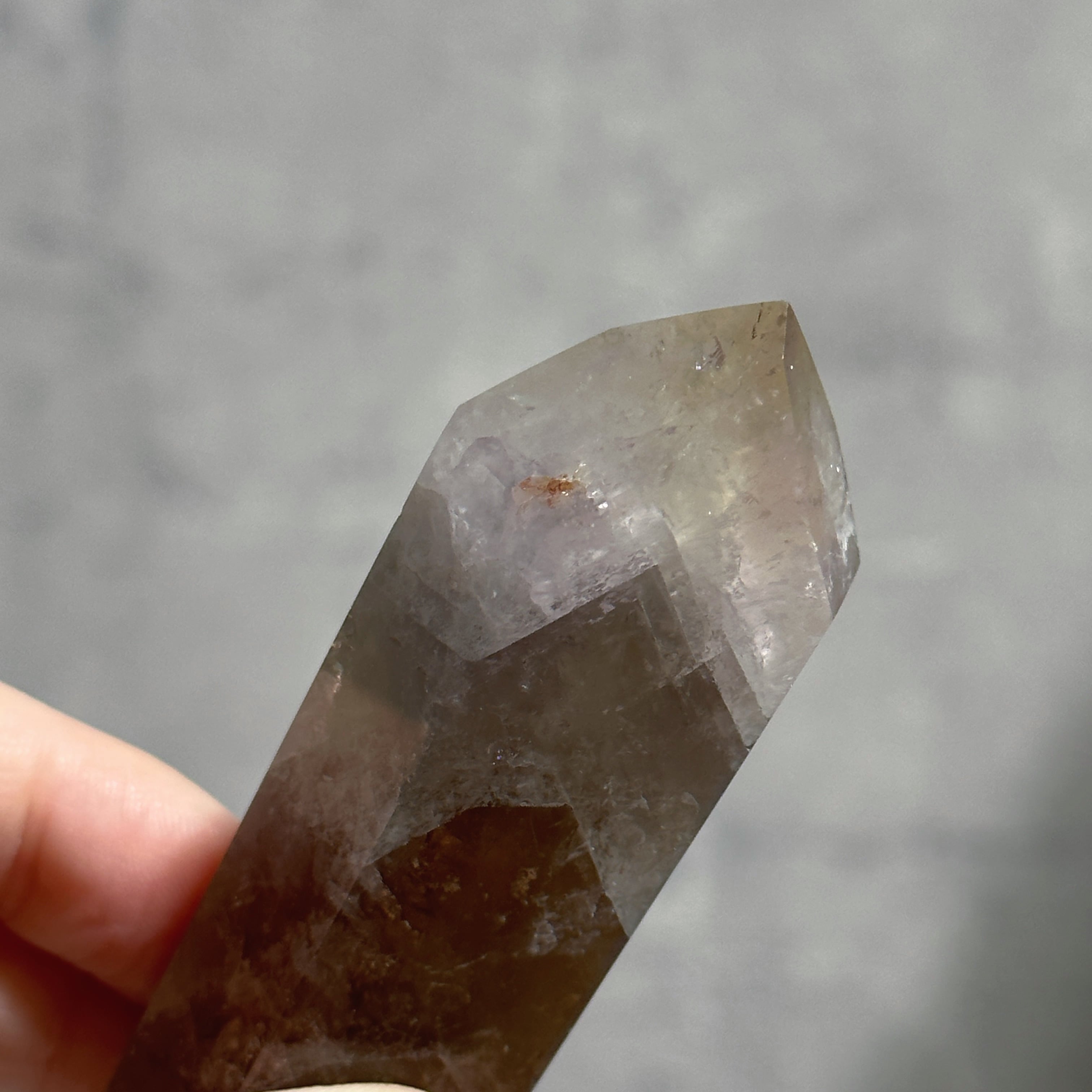 目視ではアメジスト、クリアクォーツ、スモーキークォーツが確認でき、それぞれが一つの石の中で混ざり合ったり、線状に切り替わったりし、非常に個性的な造形を作り上げています。