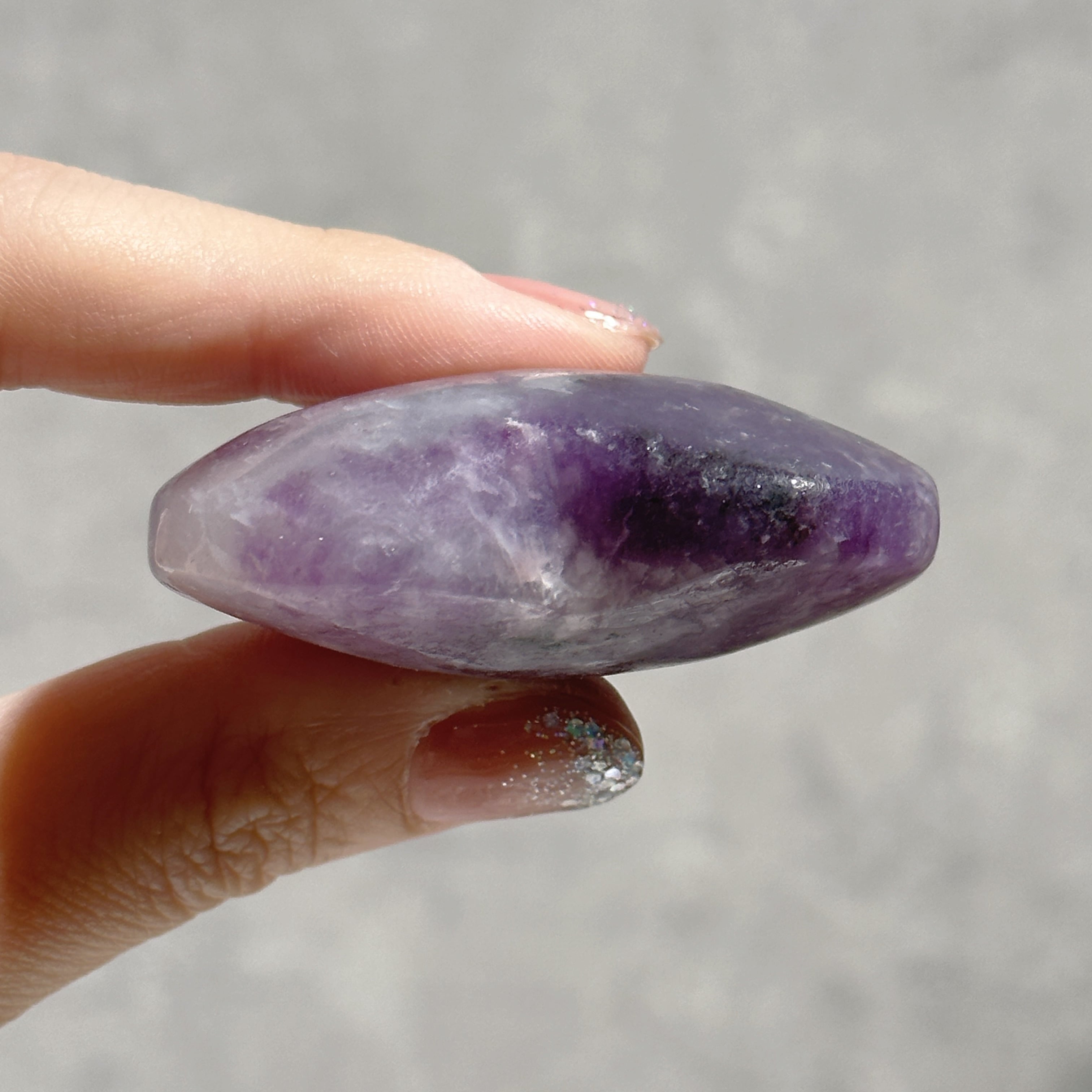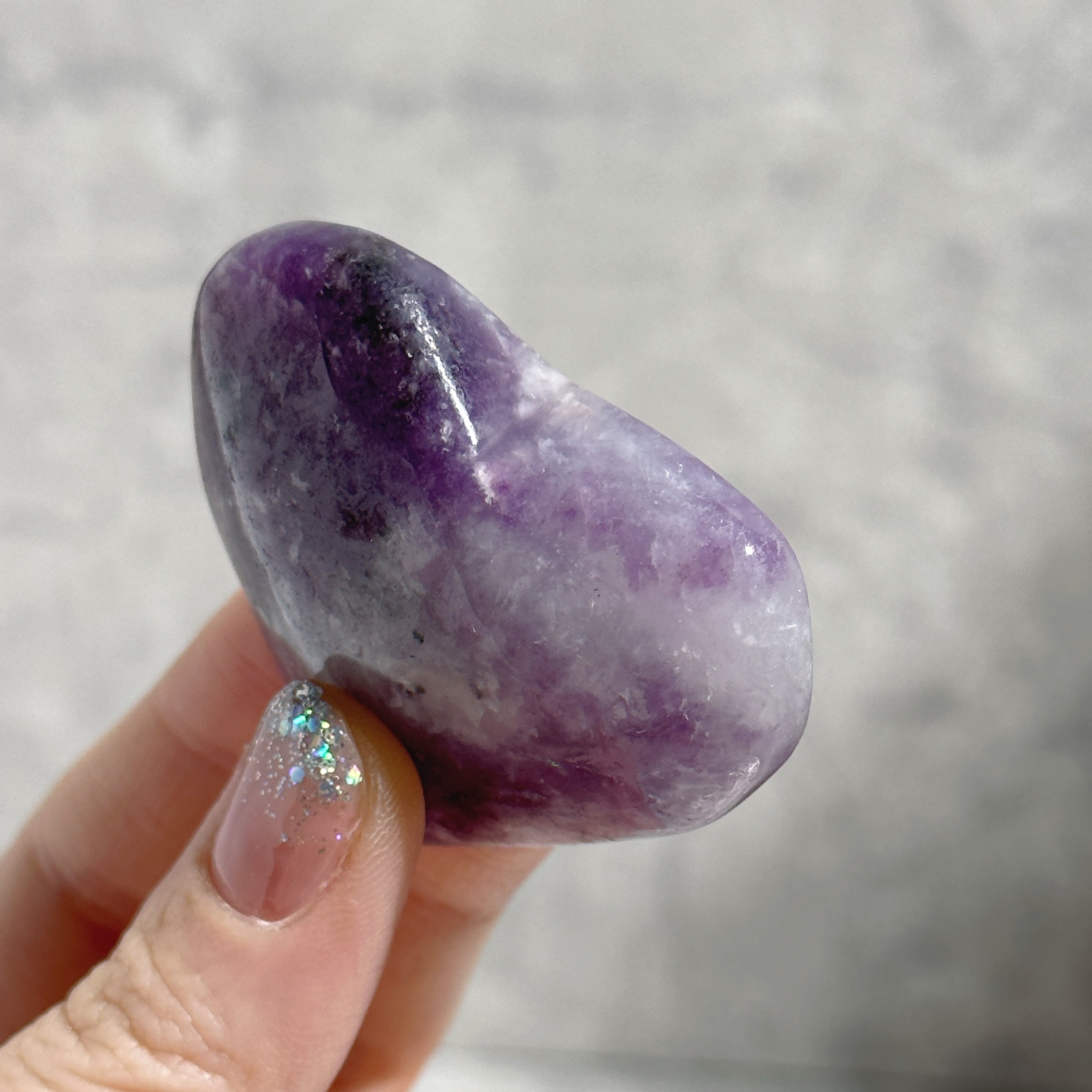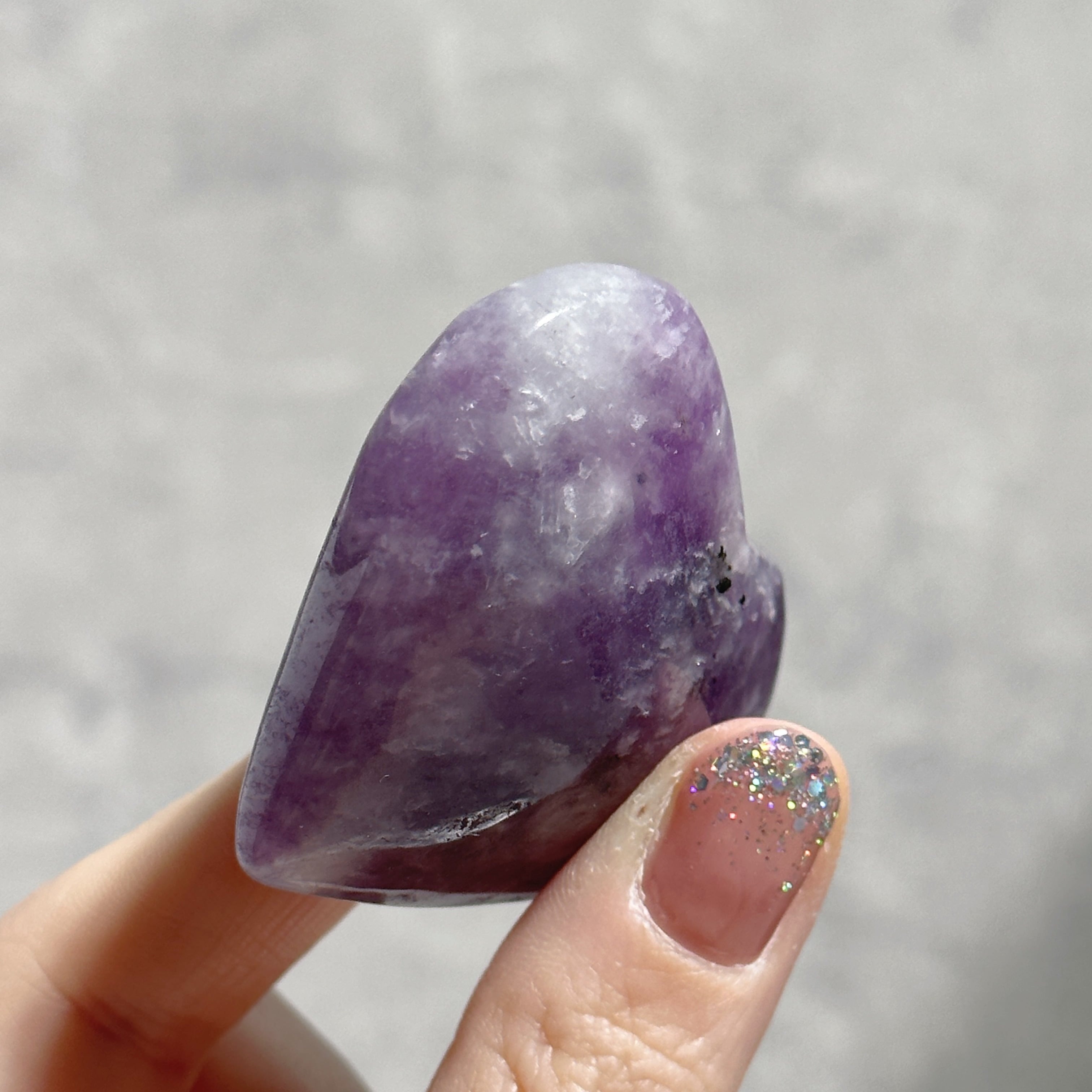 パープル色の鉱石、レピドライトの原石をハート型に研磨しました。