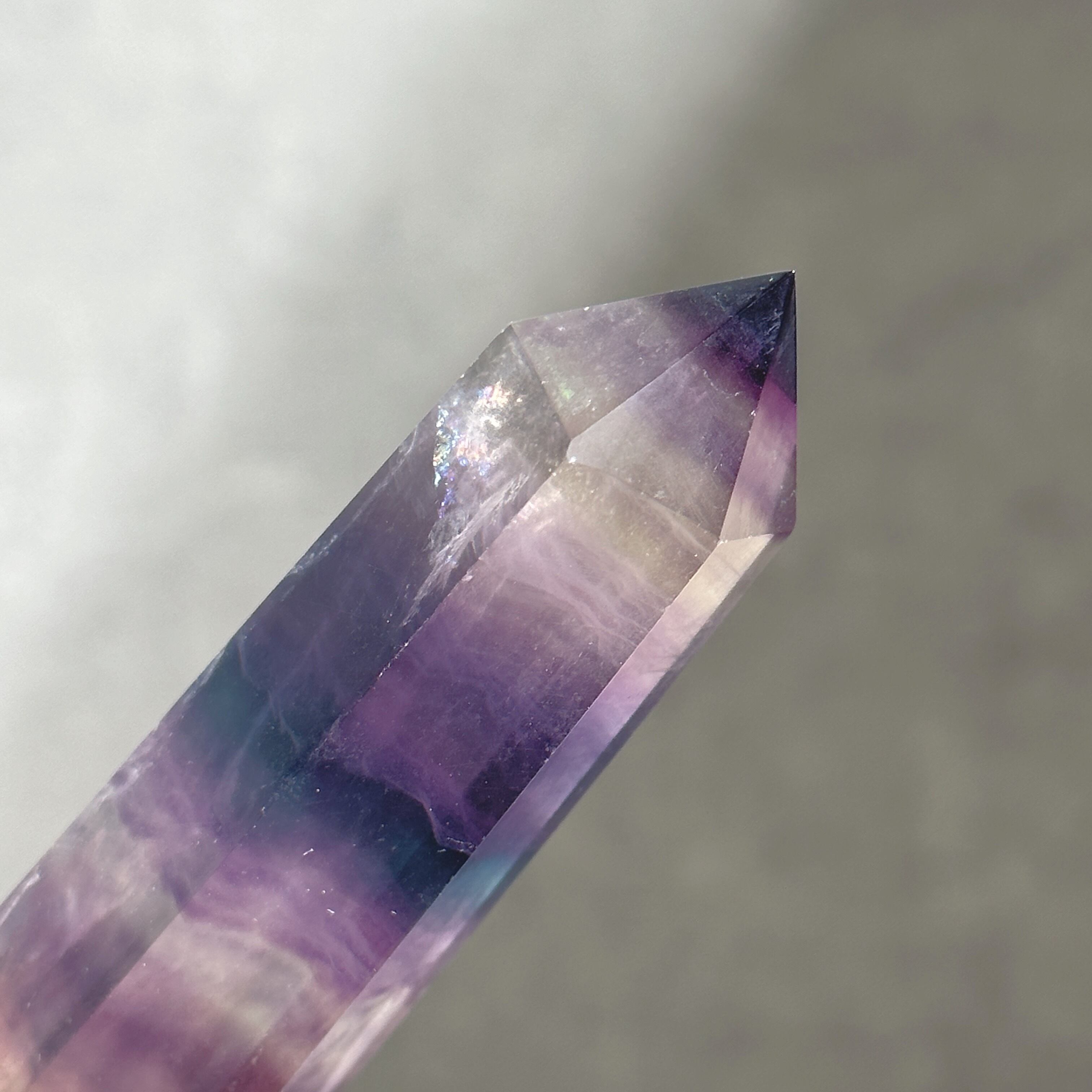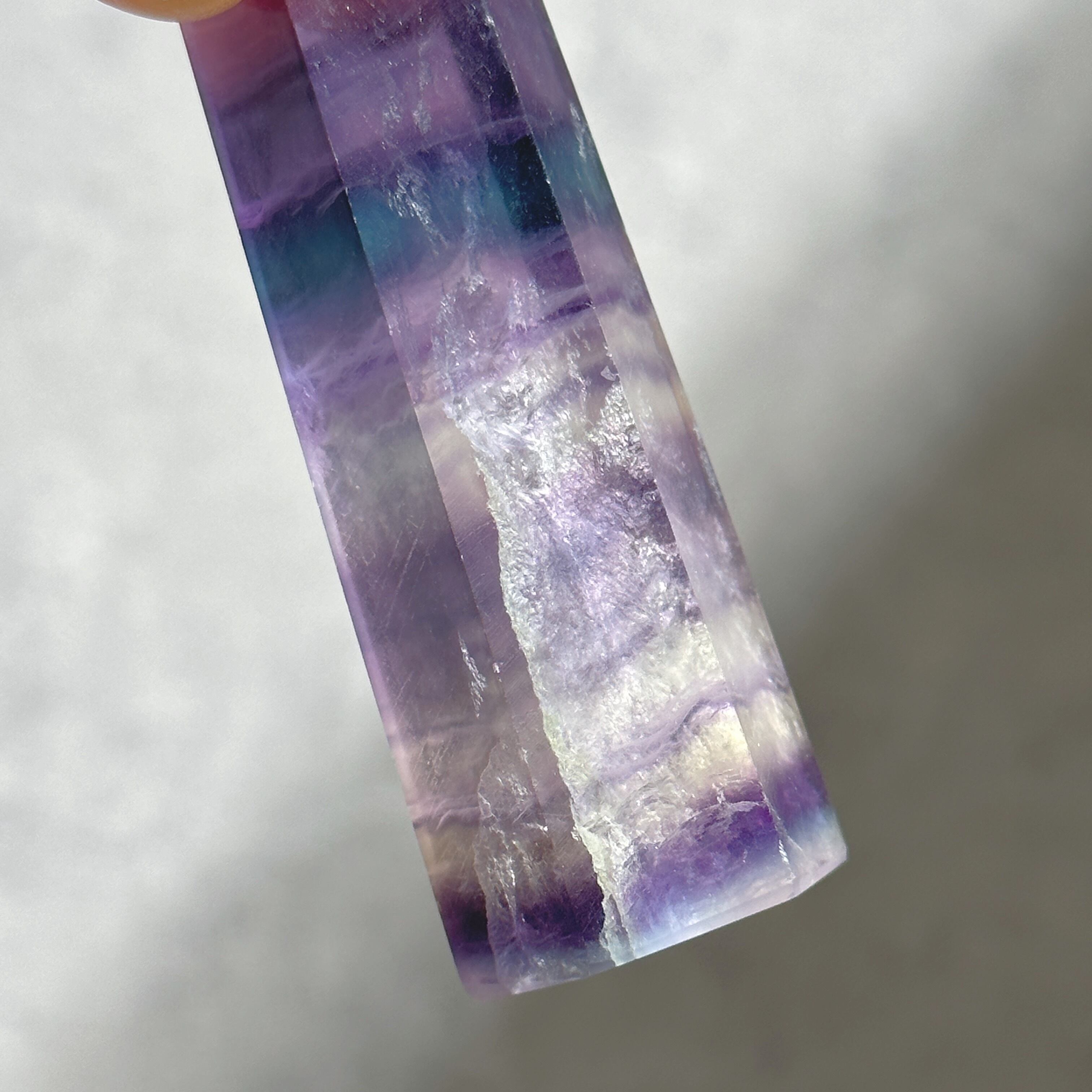 レインボーフローライトは複数のカラー(透明・パープル・ブルー・ピンク・グリーン)が共生し、水面のような曲線の模様を生み出しています。
