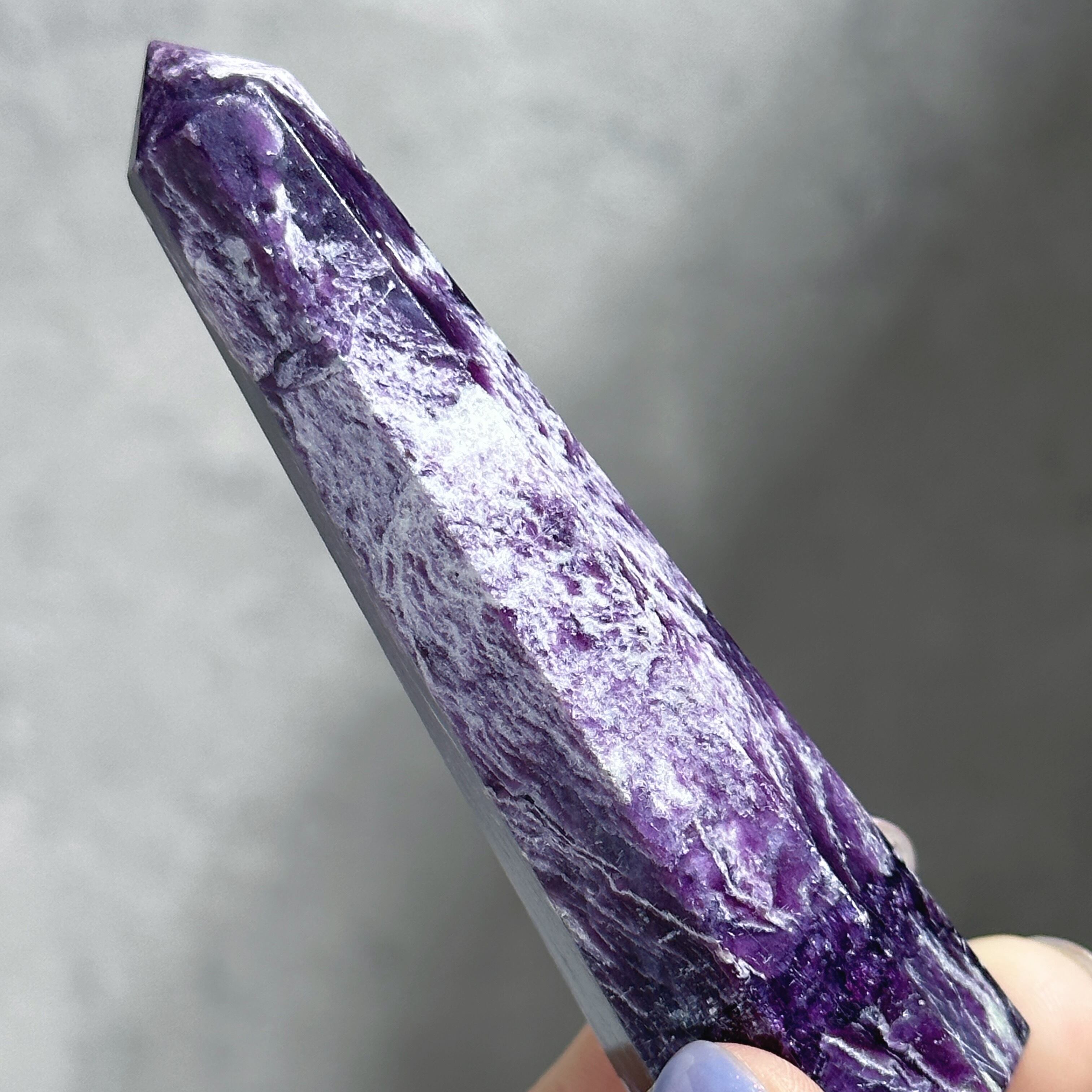 着色したかのような鮮やかさが特徴的な紫は、クローライトにわずかにクロムを含むことで発色したもので、すみれのような色から和名では「菫泥石」と呼ばれています。