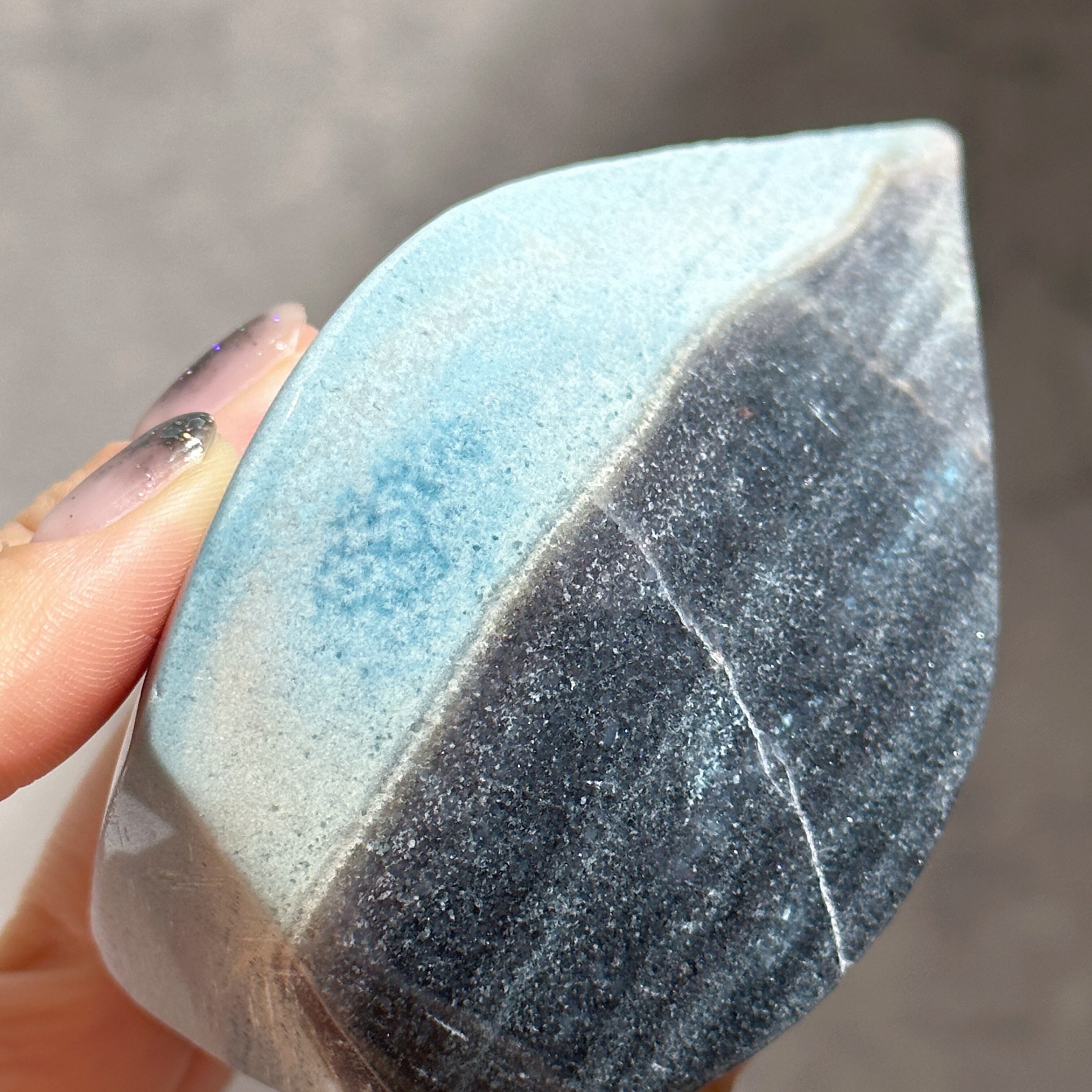 ここでは「トロレアイト」と呼びますが、トロレアイト(青)・クォーツ(白)・ラズライト(濃い青)が混じったもののようで、曲線を描くグラデーションと引き込まれるような色合いを持つ鉱物です。面によって異なる表情を見せる、世界に二つとないお品です。