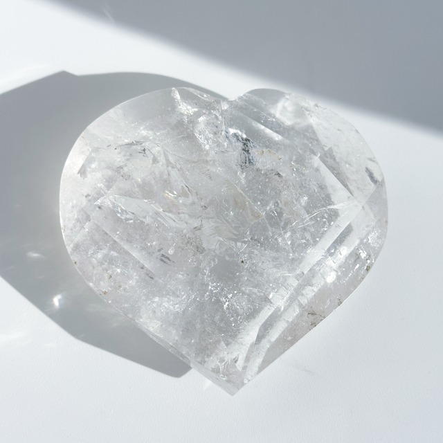 紫と白の層が紋章のような模様を生み出している「ドリームアメジスト」を、手のひらにちょうどコロンとおさまるサイズの可愛らしいハート型に加工したものをご紹介いたします。