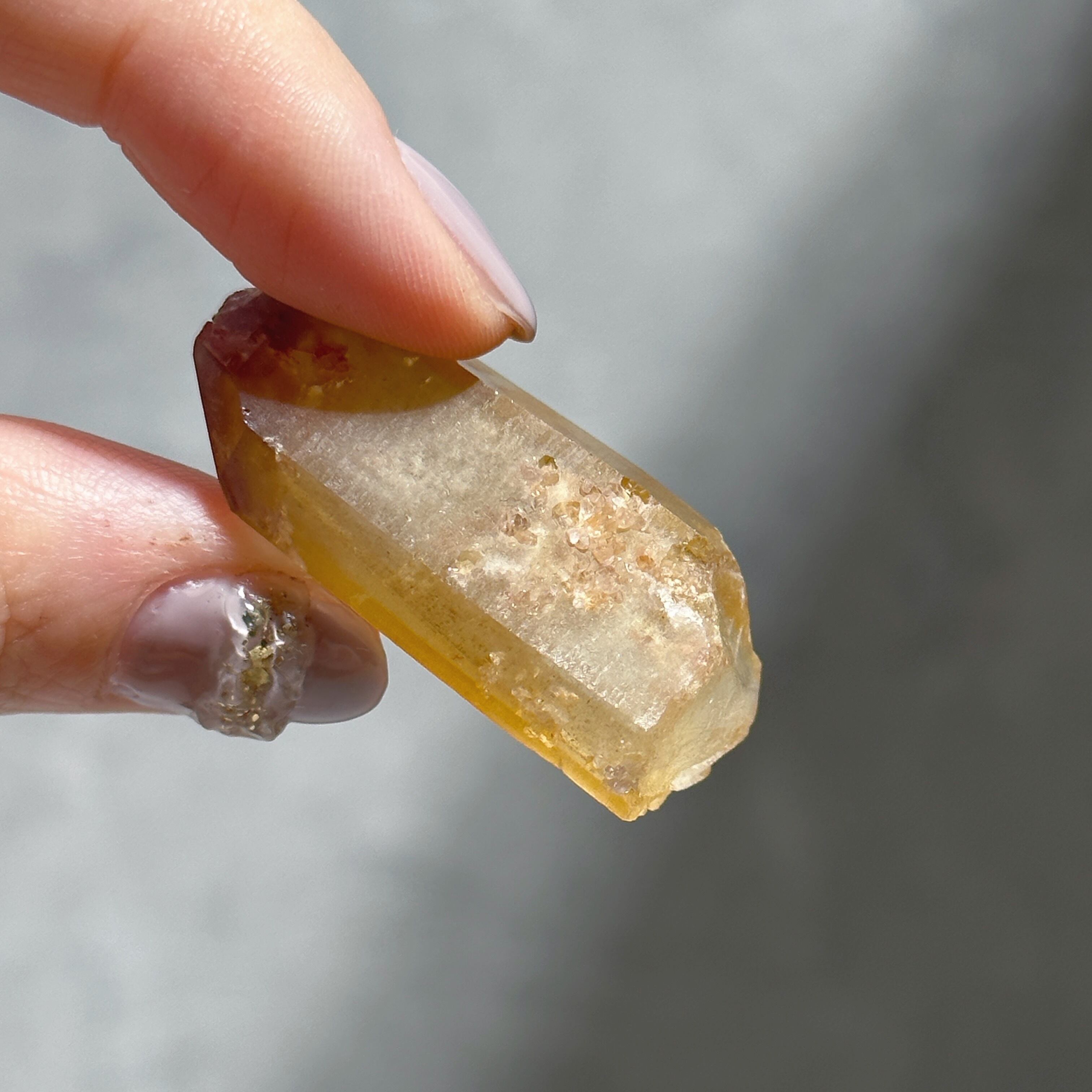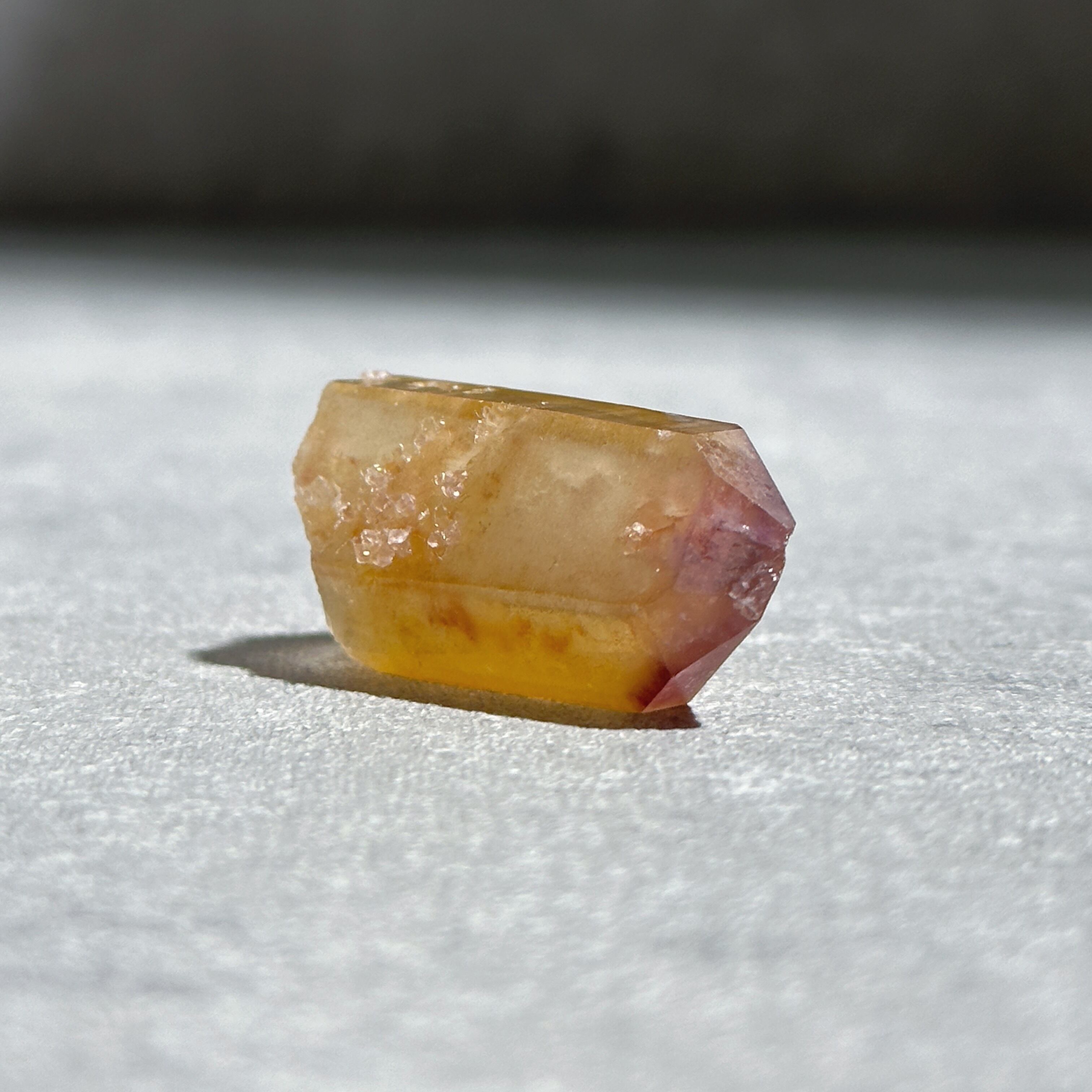 オレンジに色付いた部分は、水晶の表面にヘマタイトなどの鉄分を含んだタンジェリンクォーツと呼ばれるもので、トップにはアメジストが帽子のようにコーティングされています。