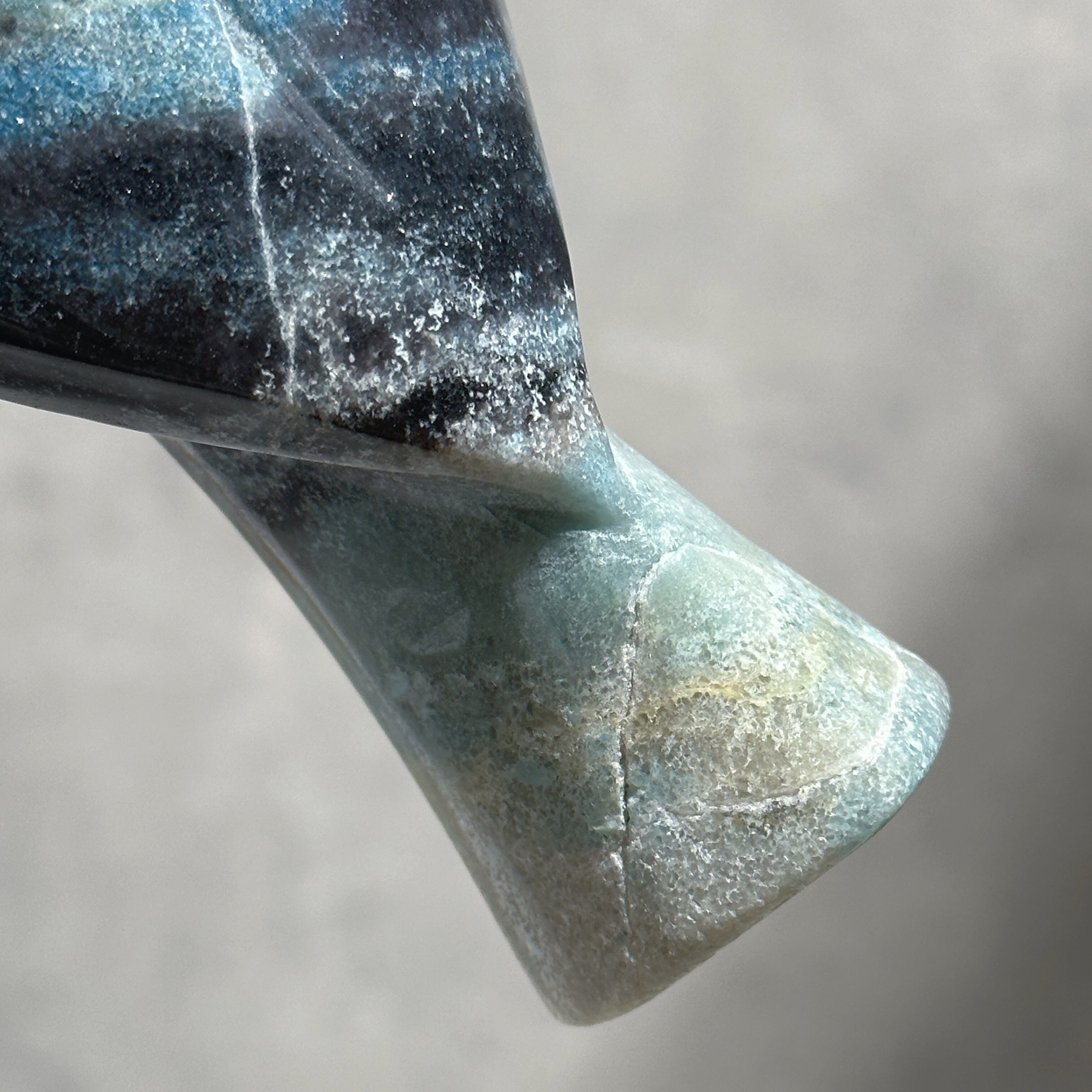 ここでは「トロレアイト」と呼びますが、トロレアイト(石英に混じると青くなる)・クォーツ(白)・ラズライト(濃い青)が混じったもののようで、曲線を描くグラデーションと引き込まれるような色合いを持つ鉱石です。