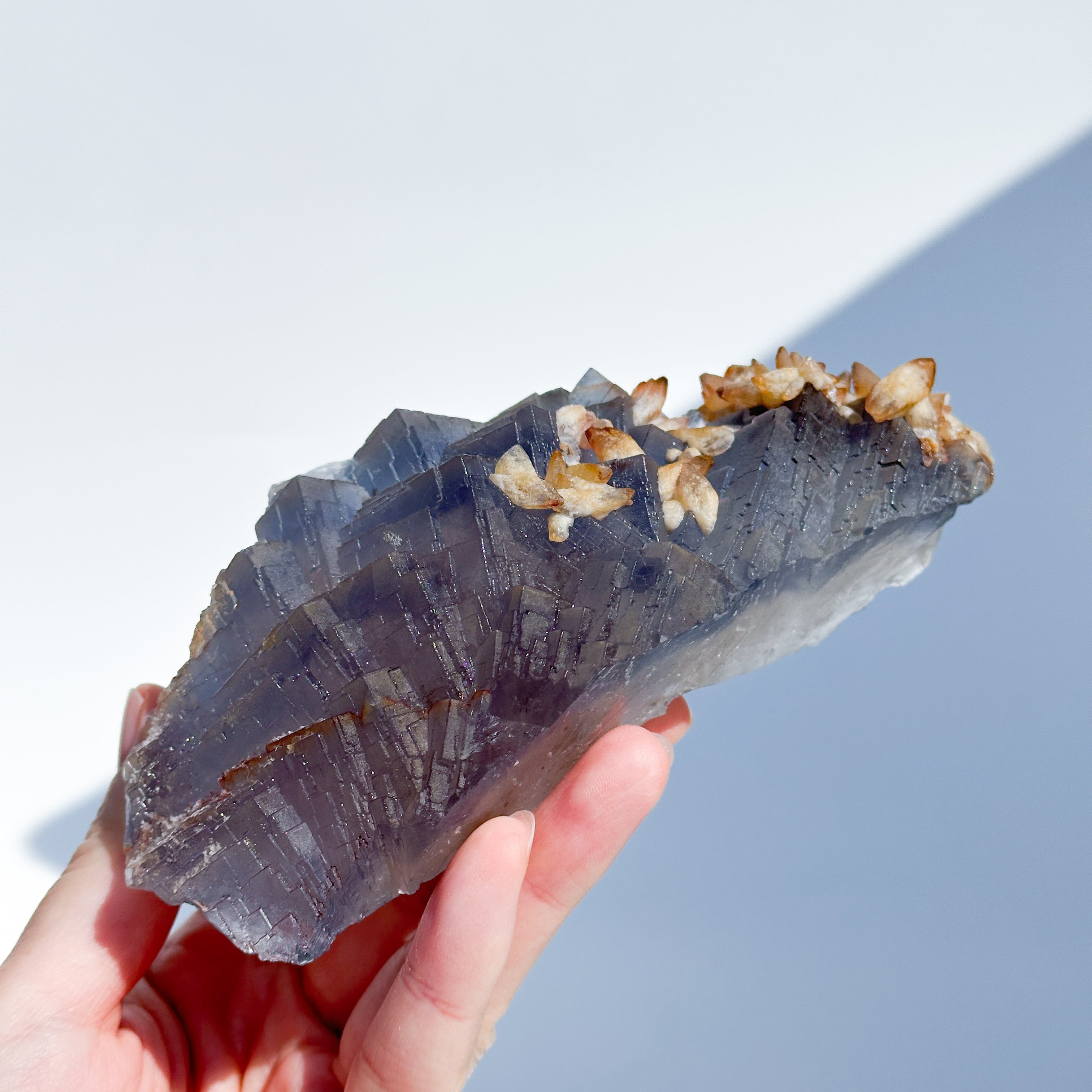 今回の子は透明~ブルーにグラデーションが見え、一部にカルサイトが共生しています。