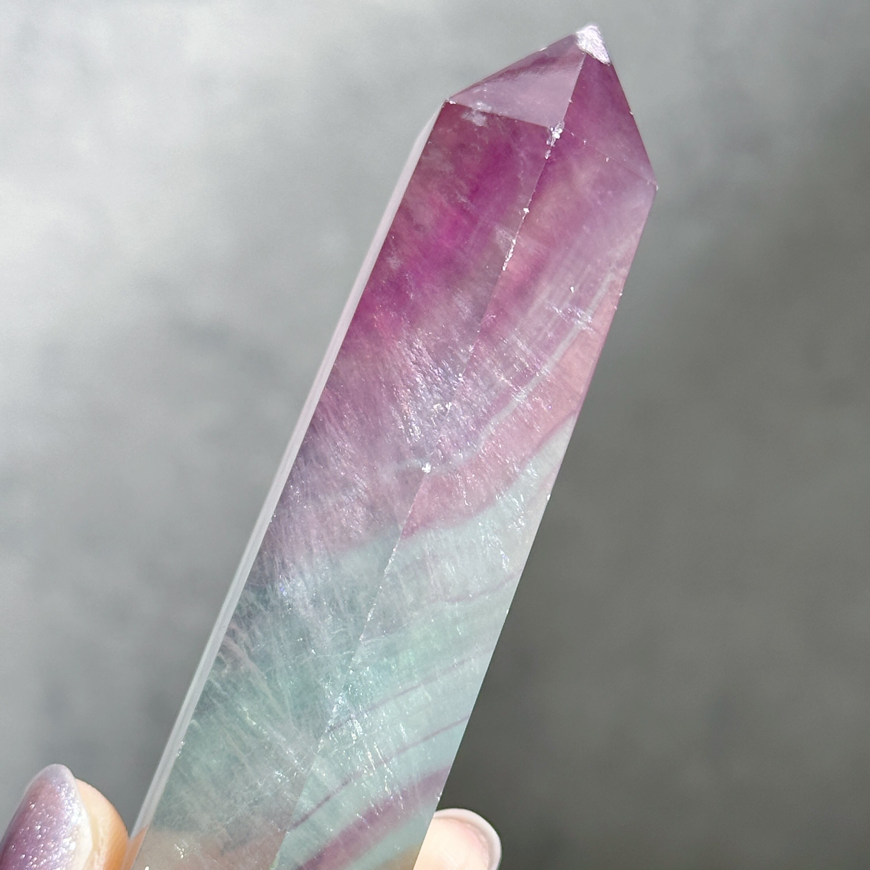 レインボーフローライトは複数のカラー(透明・パープル・ブルー・ピンク・グリーン)が共生し、水面のような曲線の模様を生み出しています。