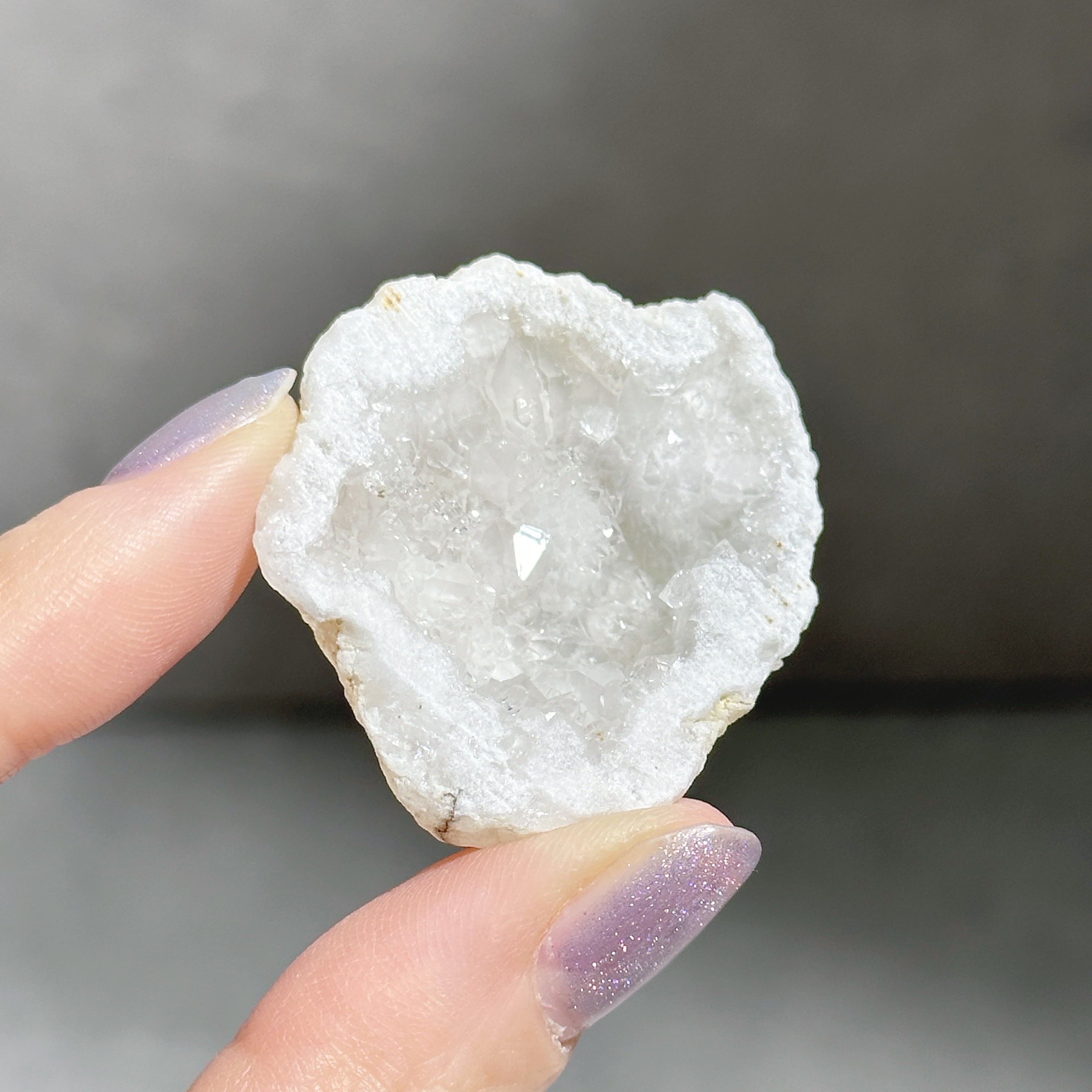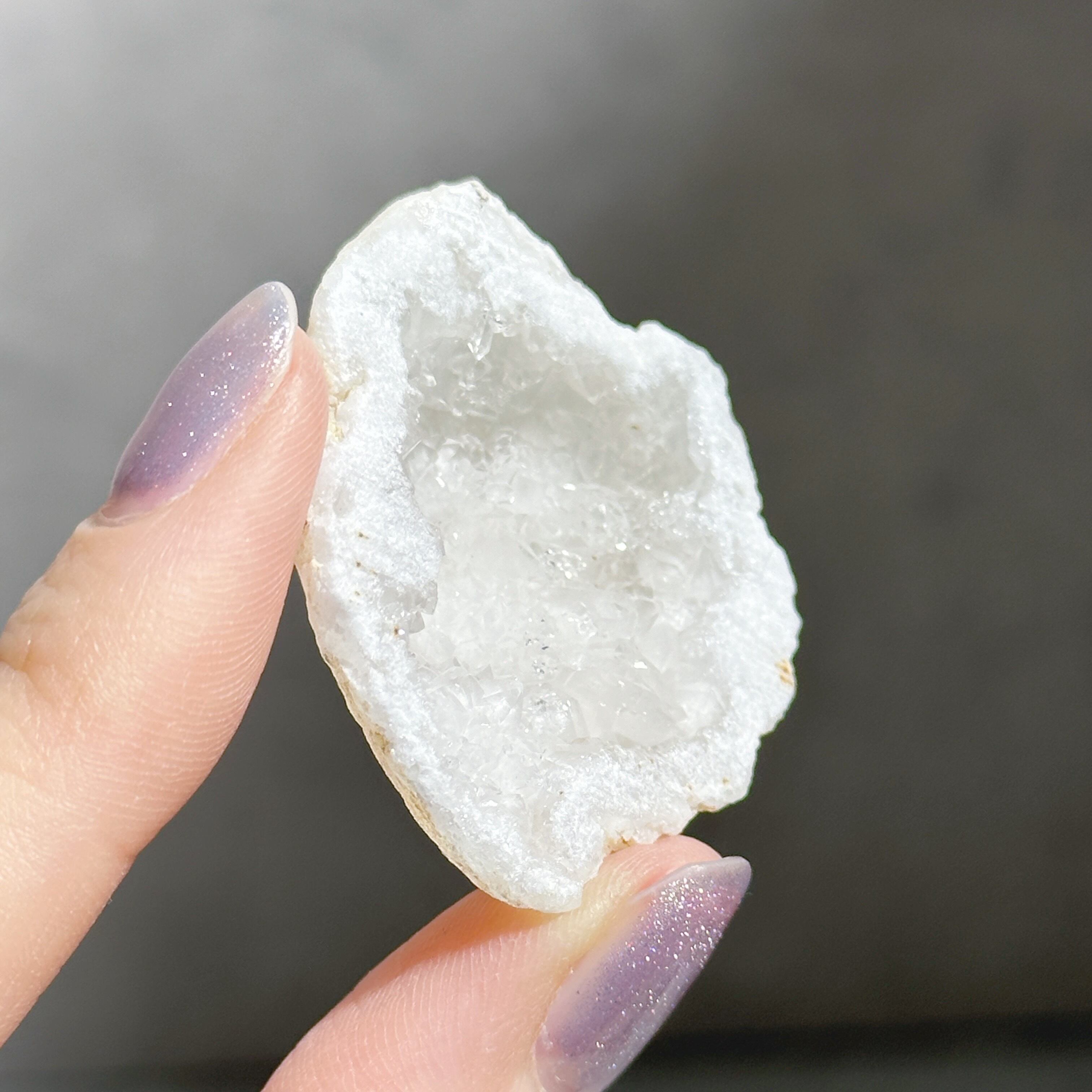 手のひらに収まるサイズ感が可愛い、小さな水晶(クリアクォーツ)のジオードです。