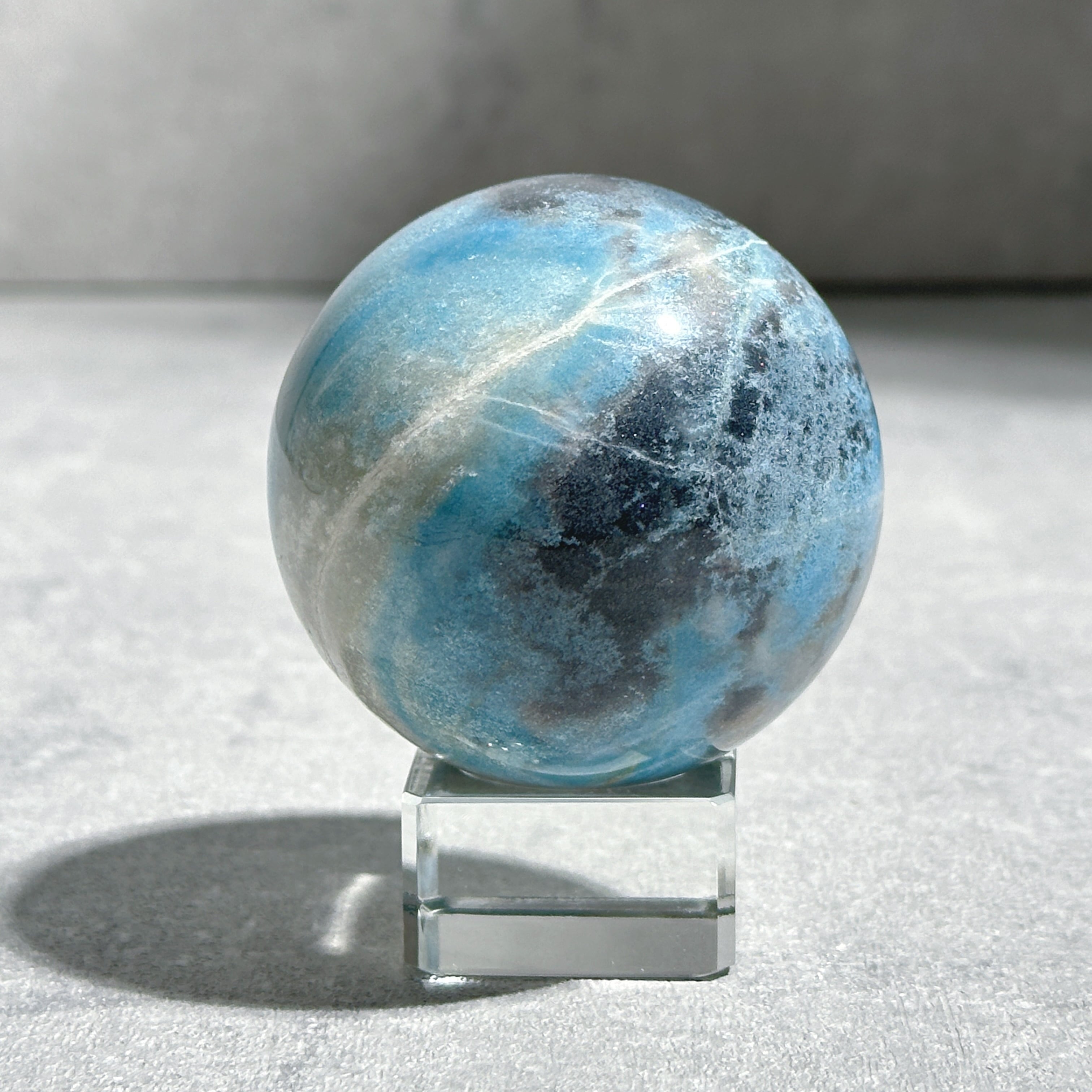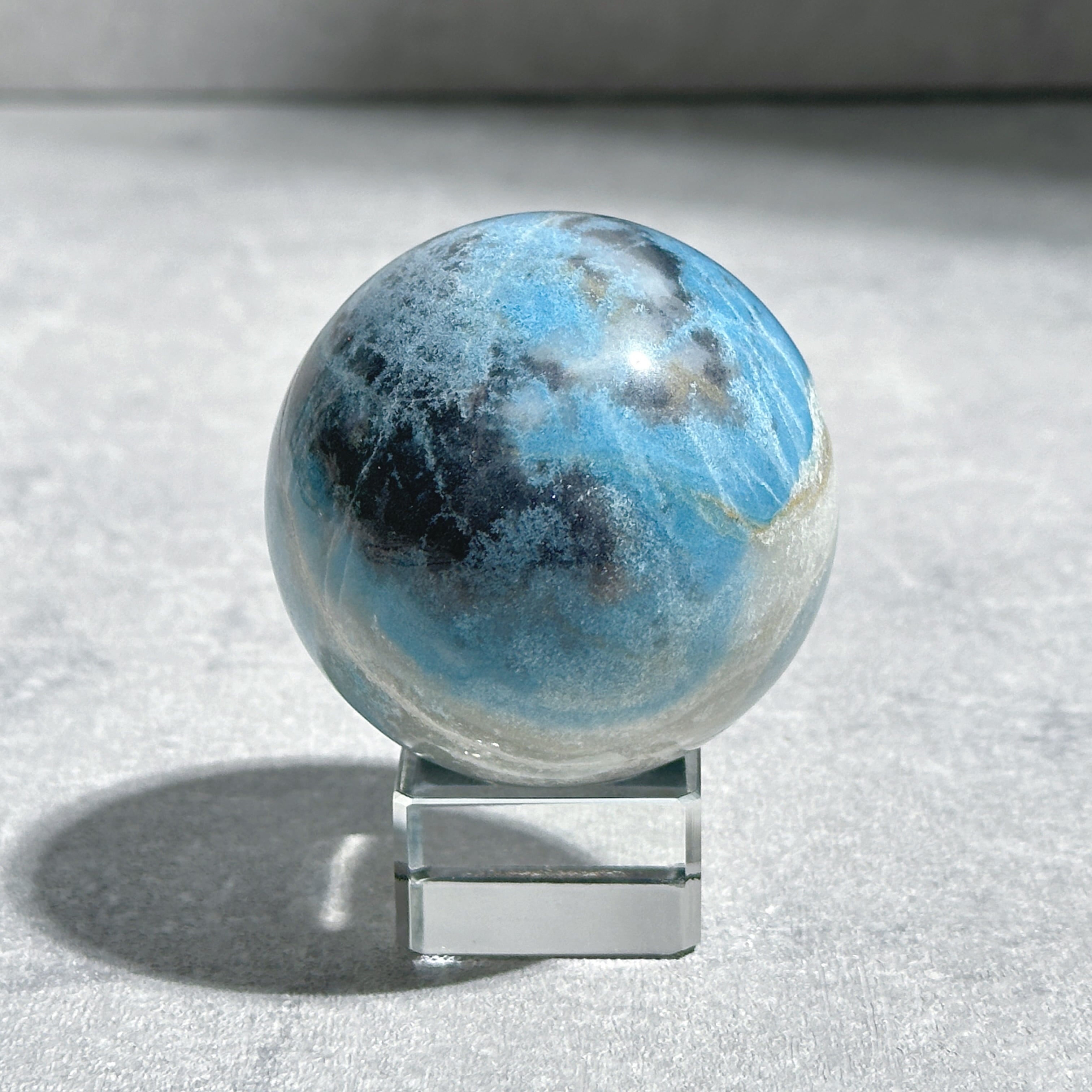 ここでは「トロレアイト」と呼びますが、トロレアイト(青)・クォーツ(白)・ラズライト(濃い青)が混じったもののようで、曲線を描くグラデーションと引き込まれるような色合いを持つ鉱物です。面によって異なる表情を見せる、世界に二つとないお品です。