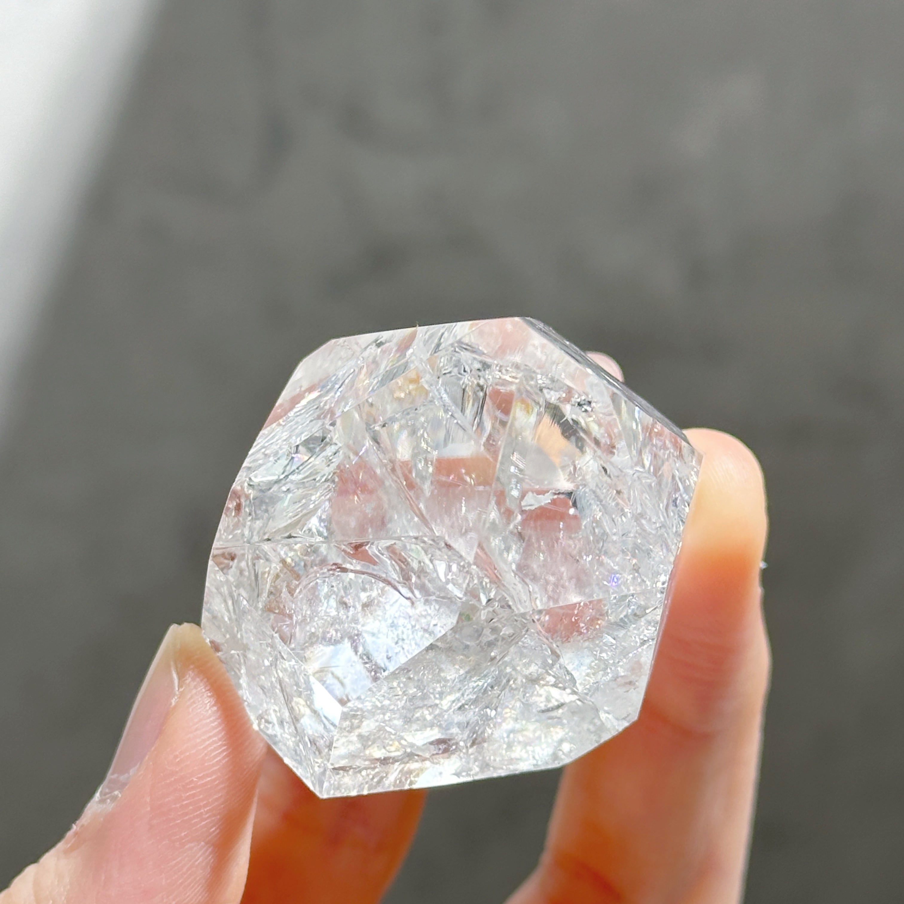 天然の水晶に熱を加えて人工的にクラックを作り、多くのレインボーを発生させるように加工したものです。