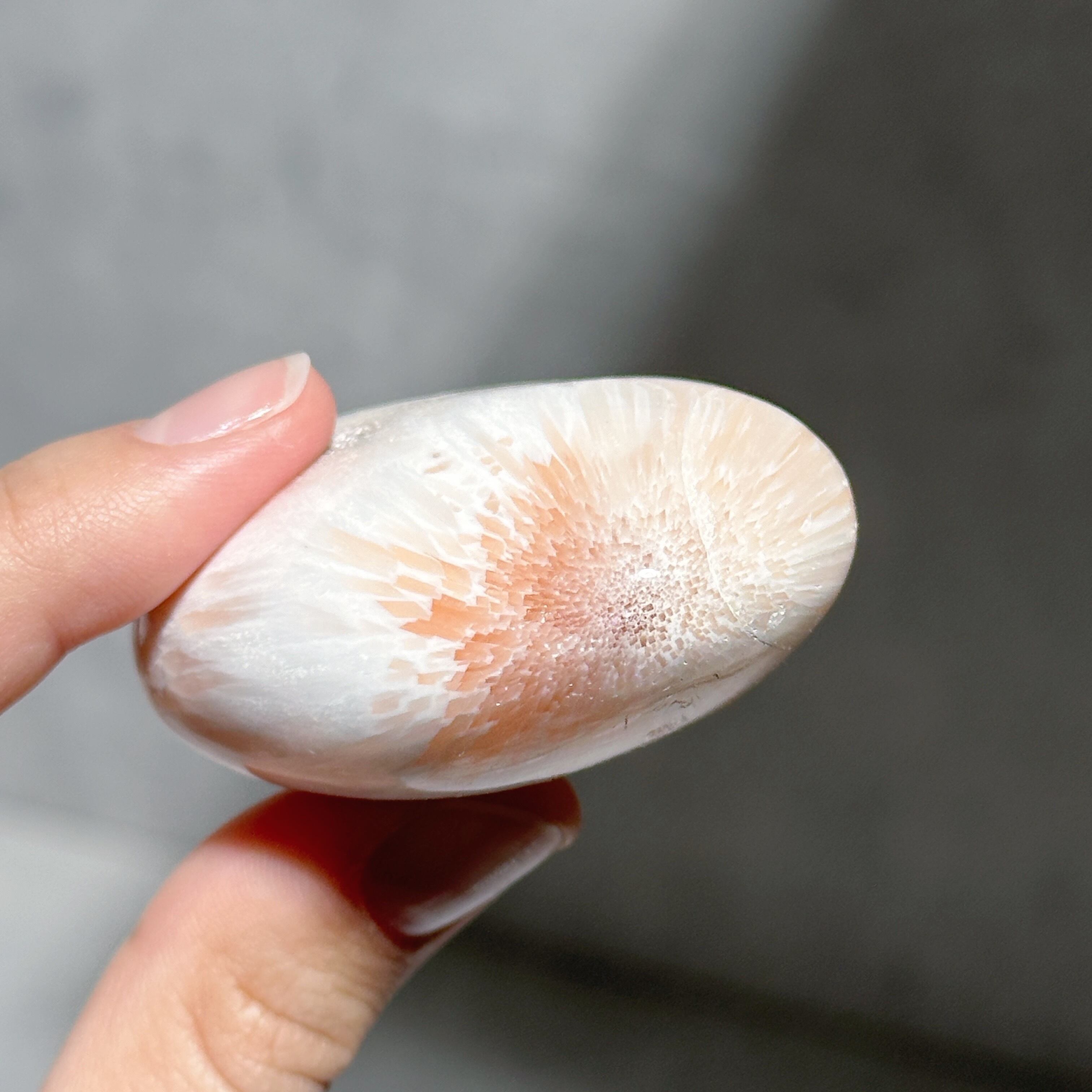 繊細なスコレサイトを滑らかなパームに研磨した、稀少なピンクスコレサイト。