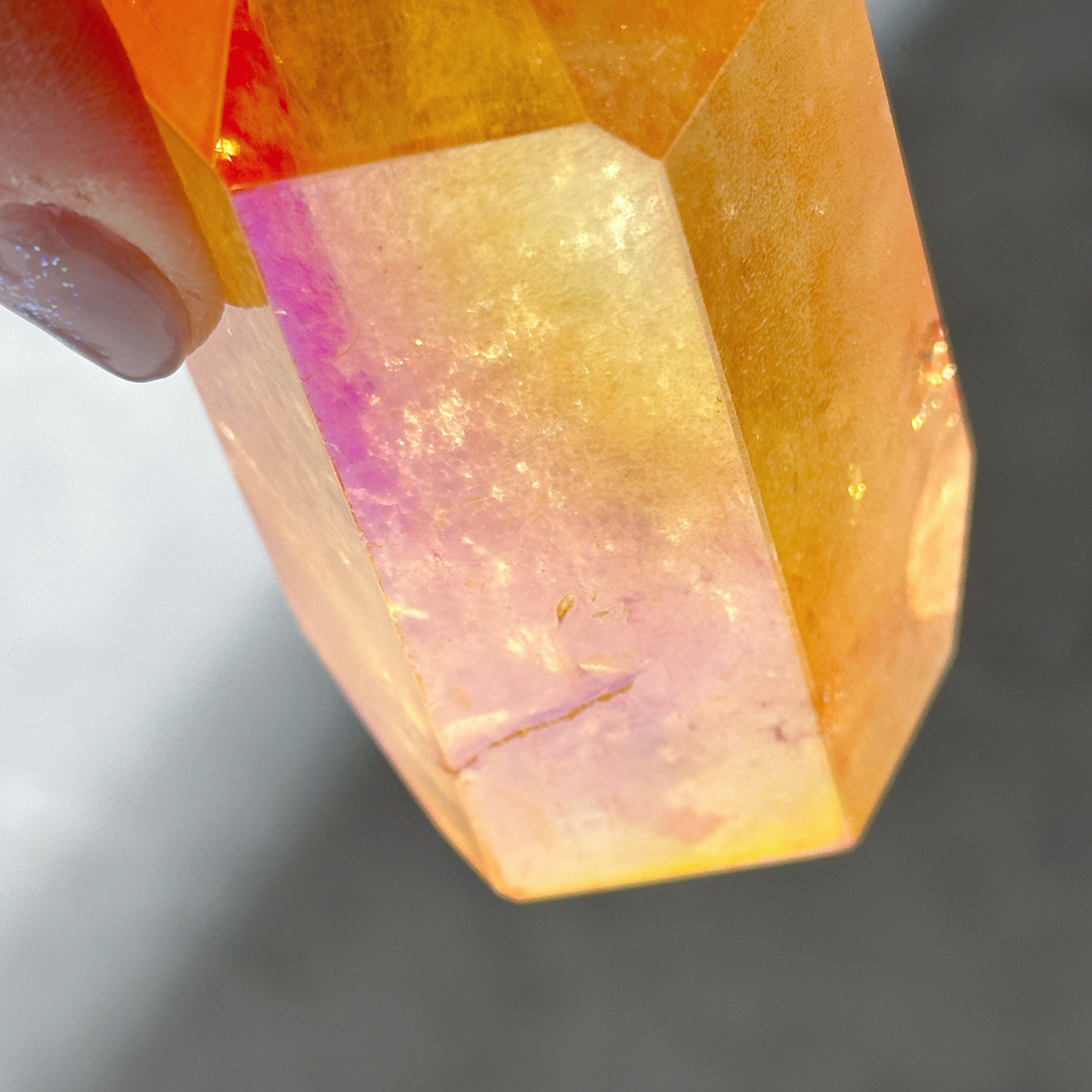 オレンジオーラクォーツは、クリアクォーツにオレンジのオーラ加工を施したクリスタルです。