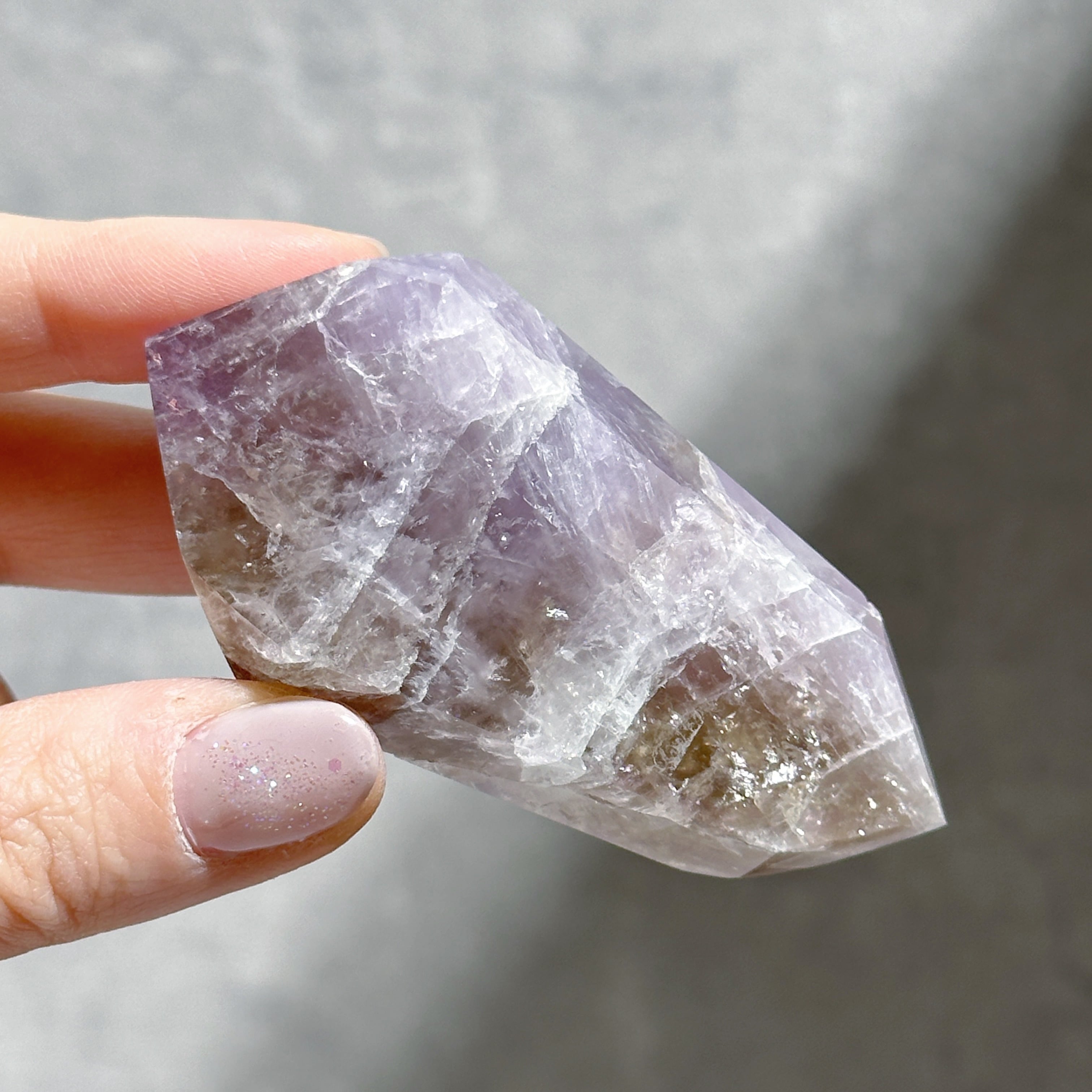 目視ではアメジスト、クリアクォーツ、スモーキークォーツが確認でき、それぞれが一つの石の中で混ざり合ったり、線状に切り替わったりし、非常に個性的な造形を作り上げています。