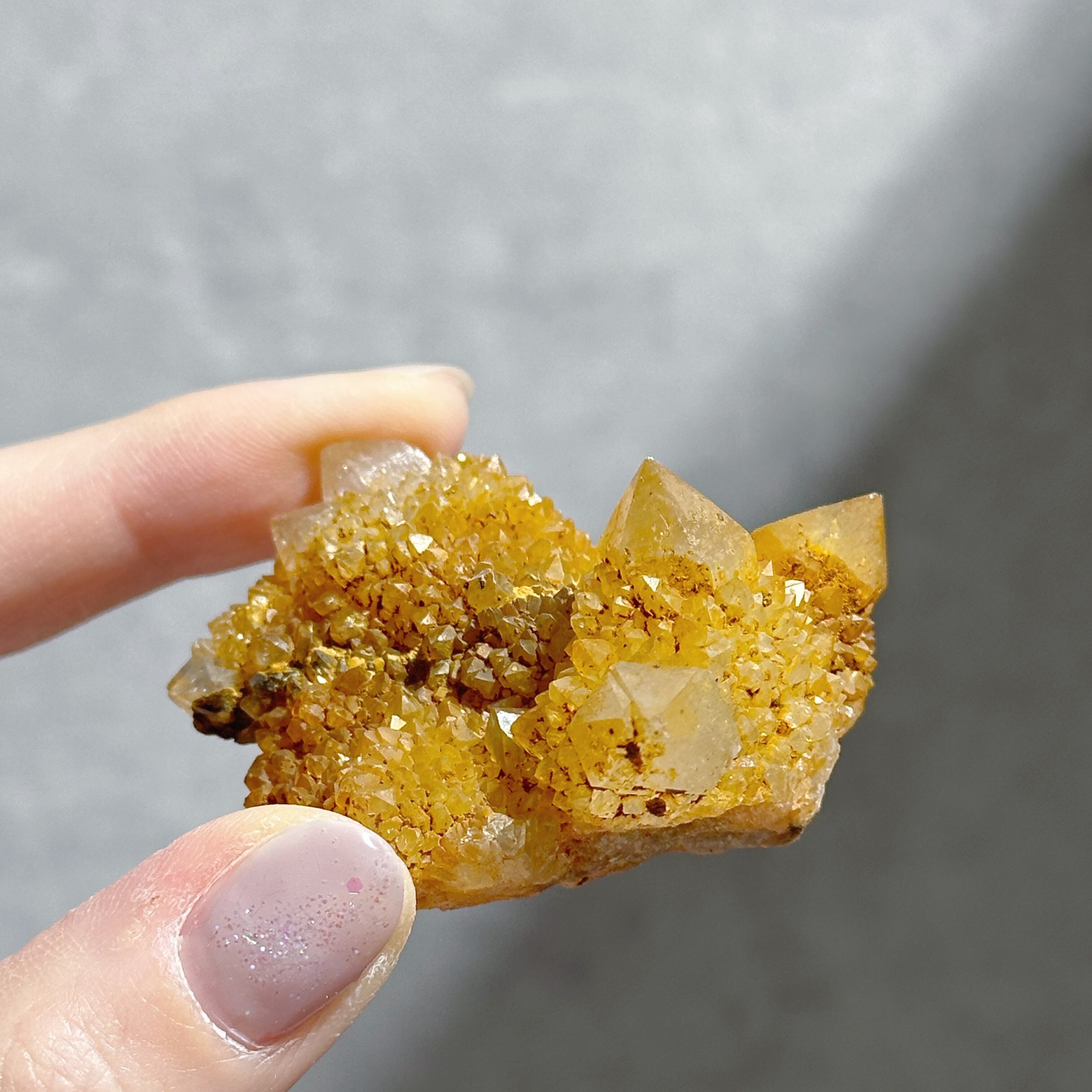よく見られるタイプはアメジストの紫に色付いたものが多いですが、こちらは全体が濃いイエローを纏って黄金色のよう。