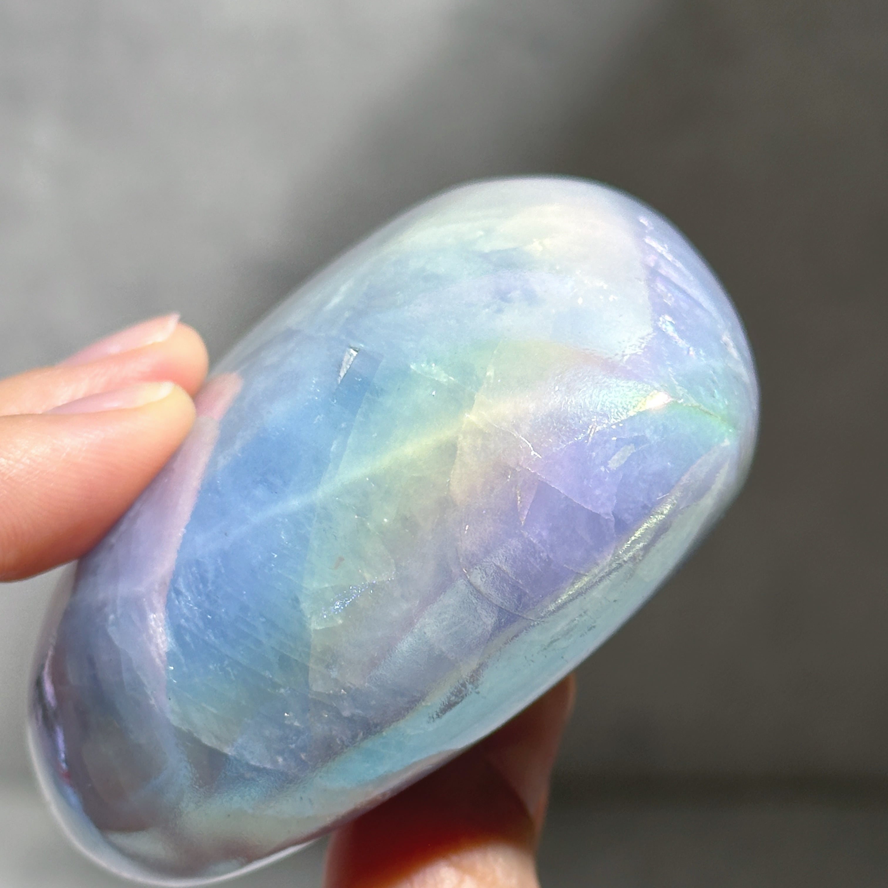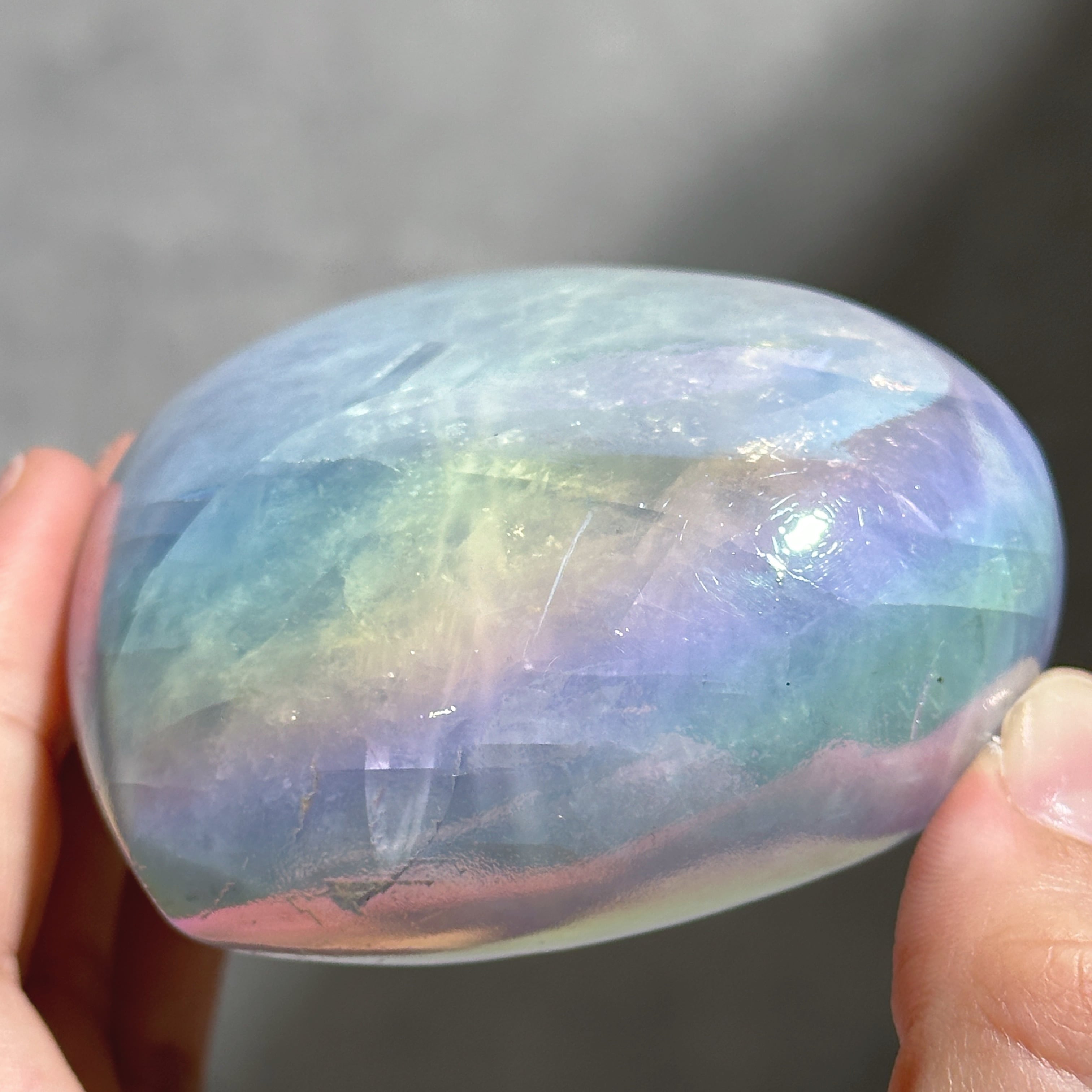 そのセレスタイトに七色の輝きが美しいオーラ加工(表面に金属の膜を癒着させたもの)を施し、より多幸感を感じるお品になりました。