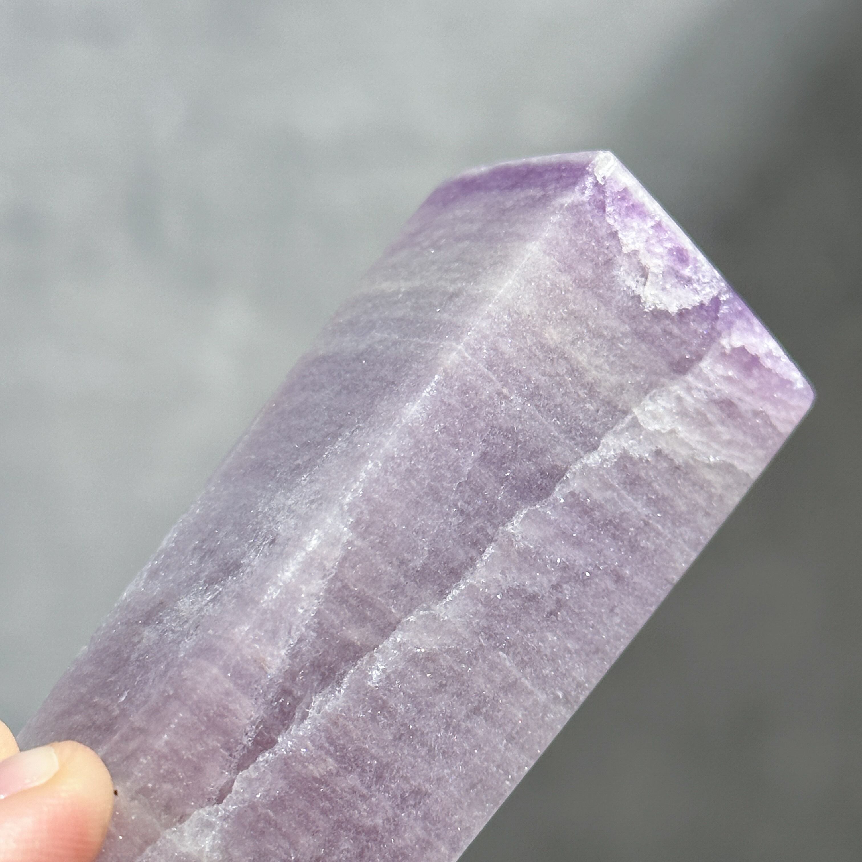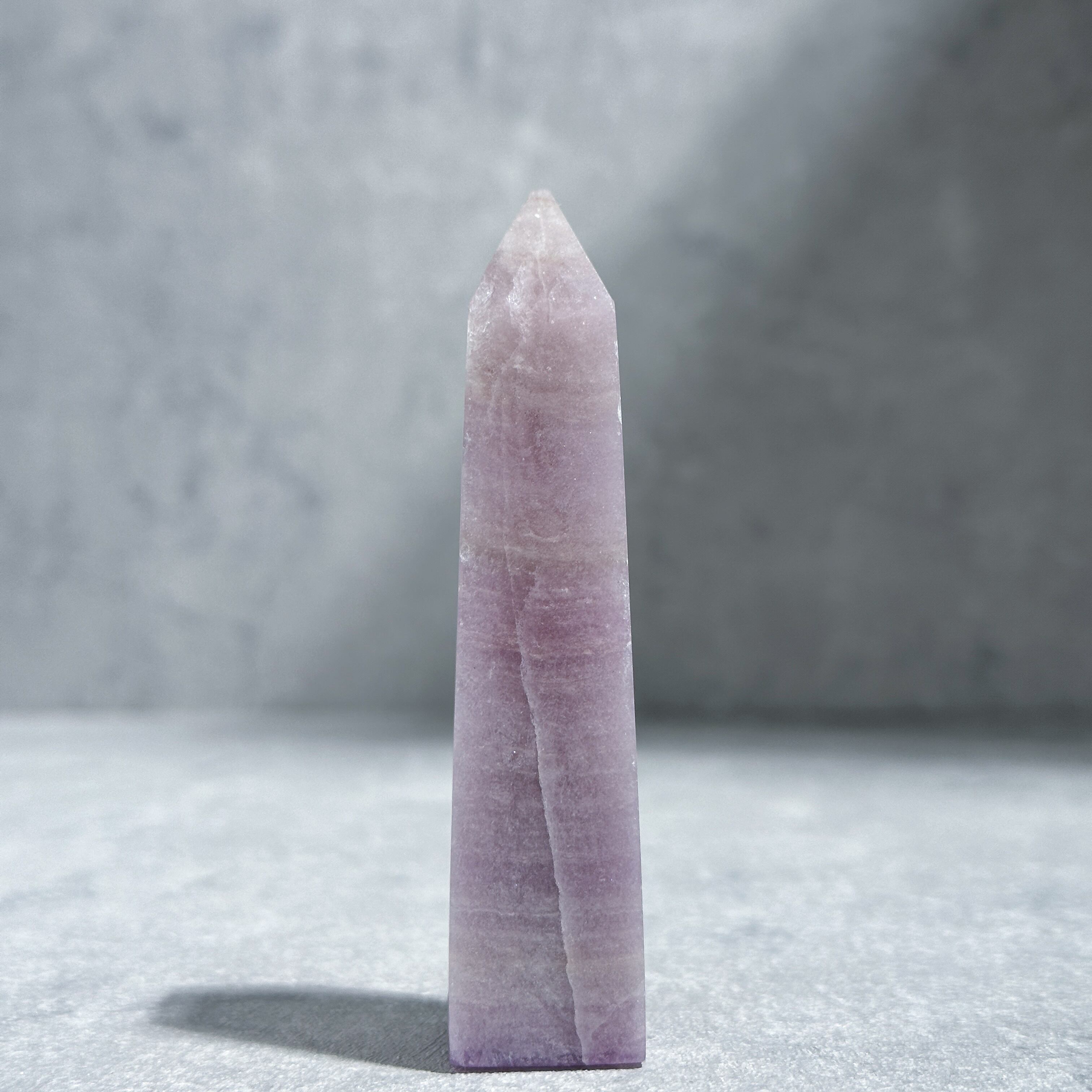 淡いライラックカラーと縞模様が不思議な、シルキーフローライトのタワー。