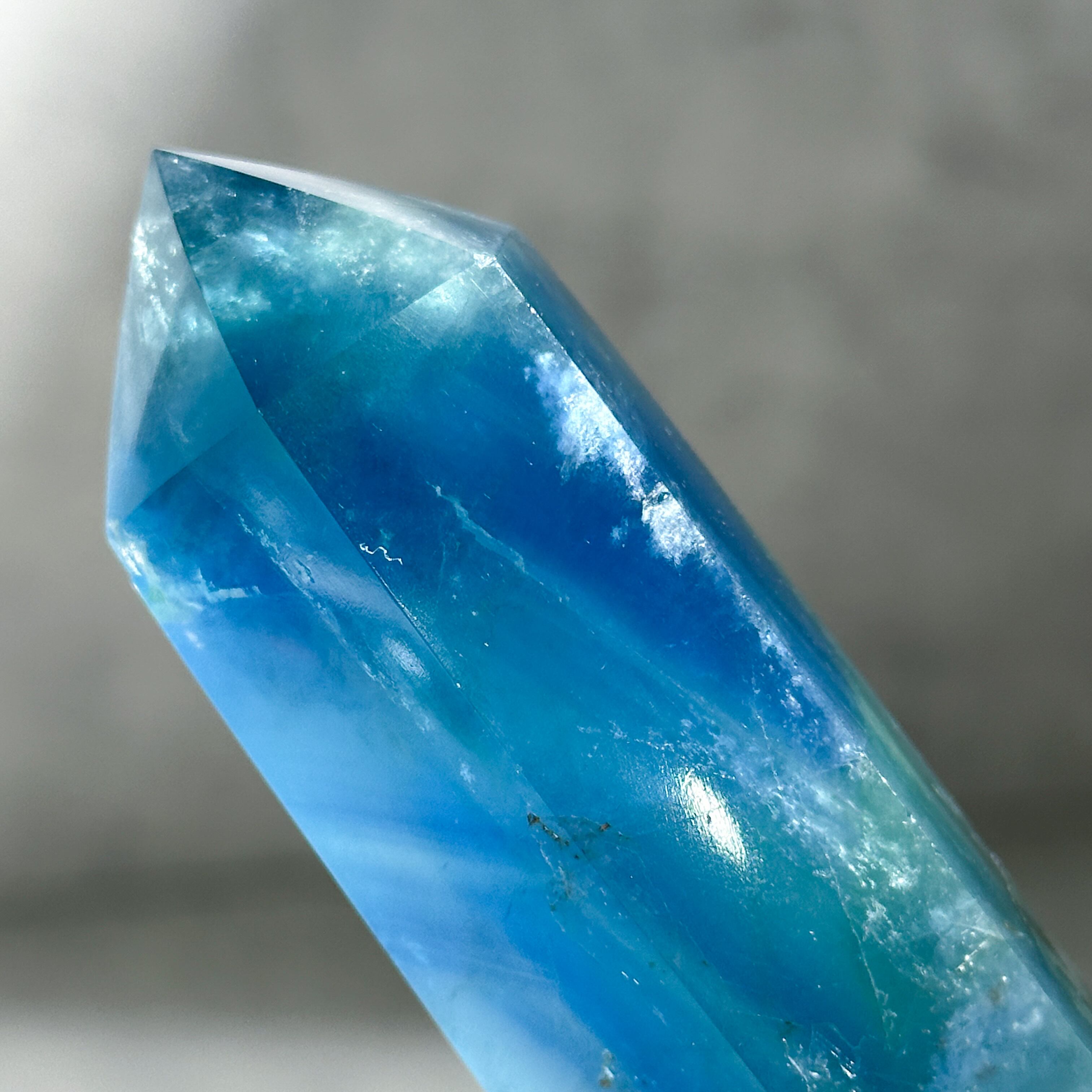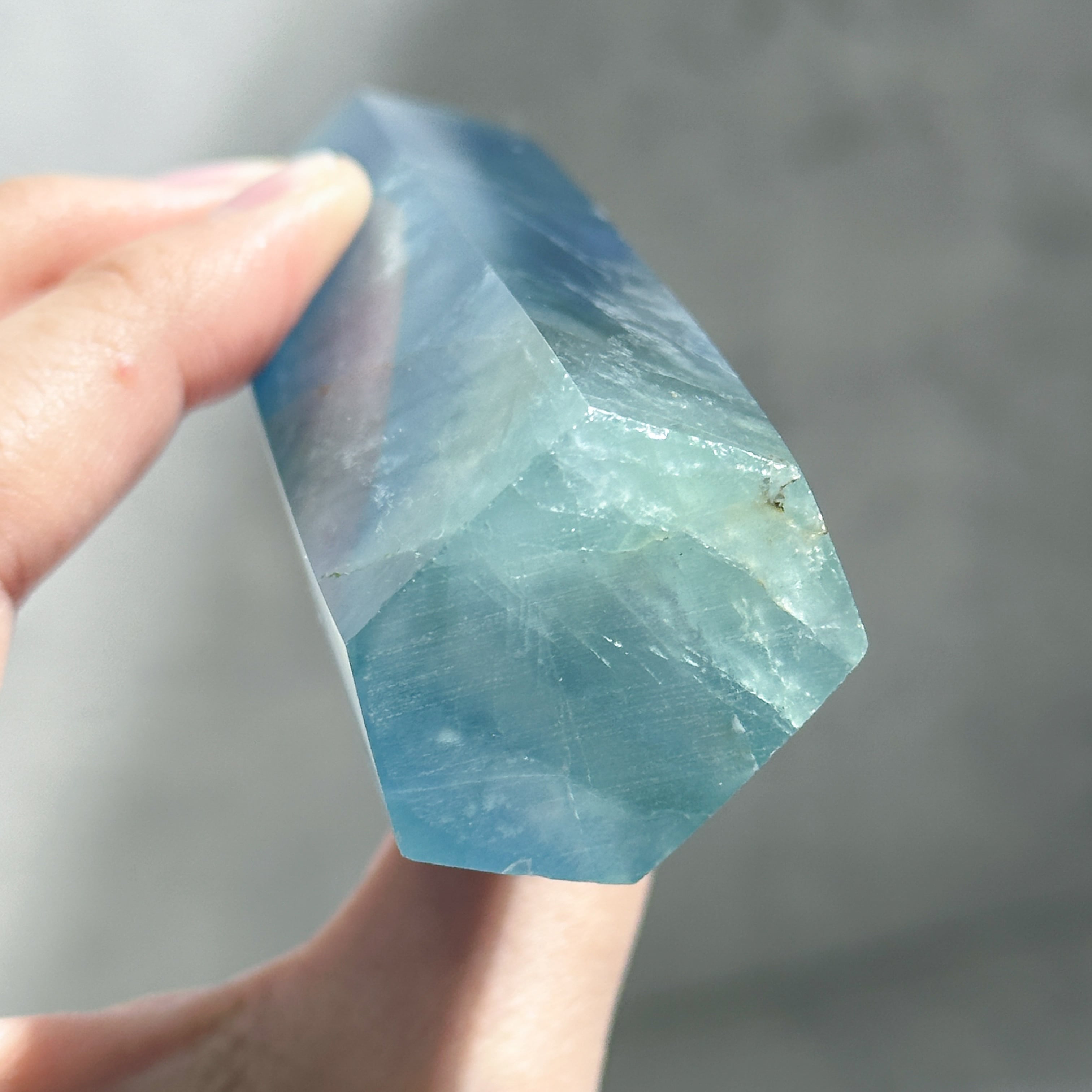 レインボーフローライトは複数のカラー(透明・パープル・ブルー・ピンク・グリーン)が共生し、水面のような曲線の模様を生み出しています。