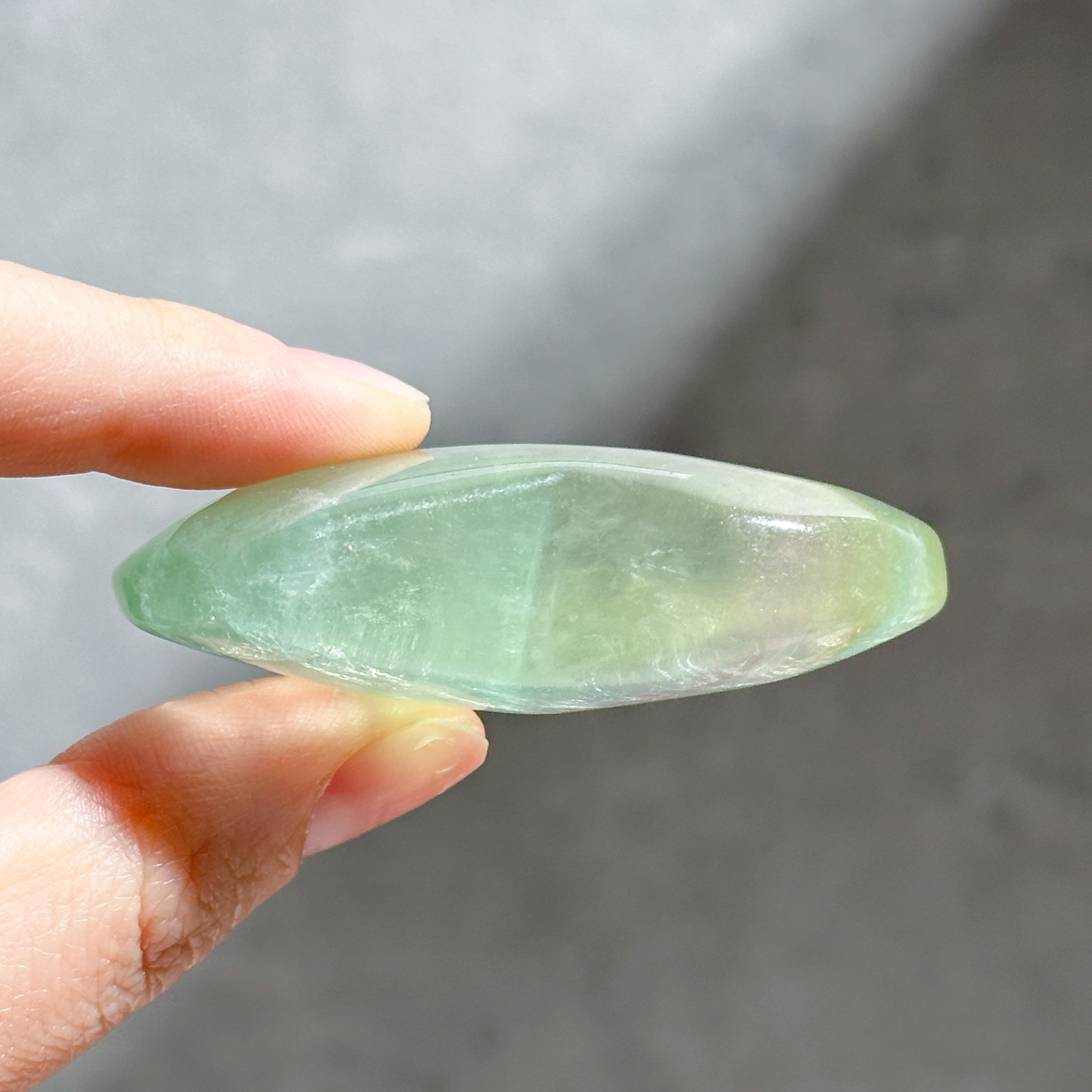 レインボーフローライトは複数のカラー(透明・パープル・ブルー・ピンク・グリーン)が共生し、水面のような曲線の模様を生み出しています。
