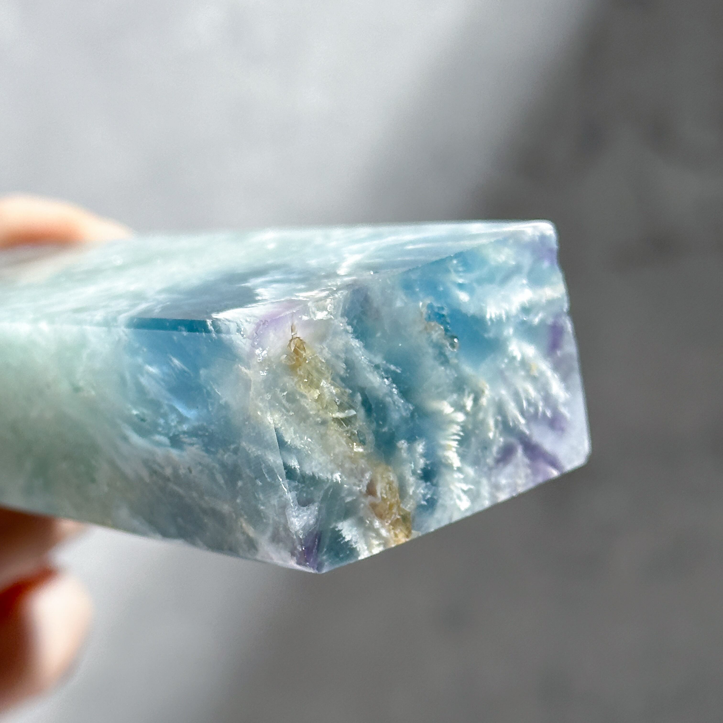 レインボーフローライトは複数のカラー(透明・パープル・ブルー・ピンク・グリーン)が共生し、水面のような曲線の模様を生み出しています。