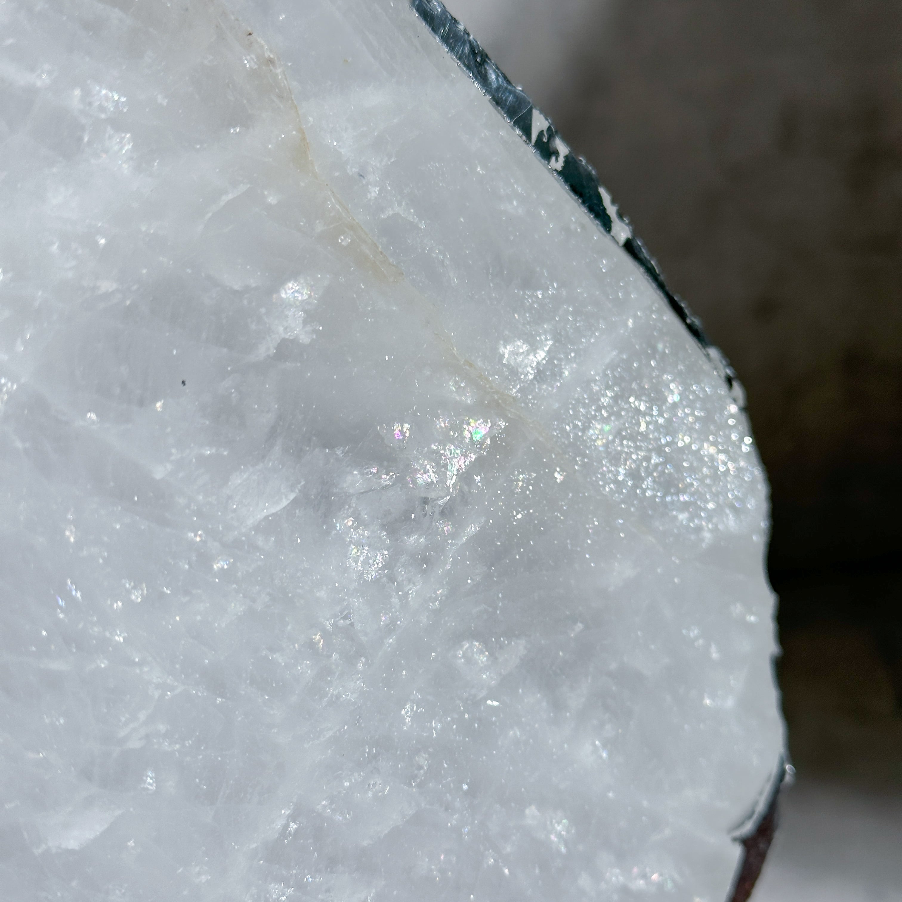 ミルキークォーツの乳白色は、結晶内に閉じ込められた微細な気泡によるものですが、