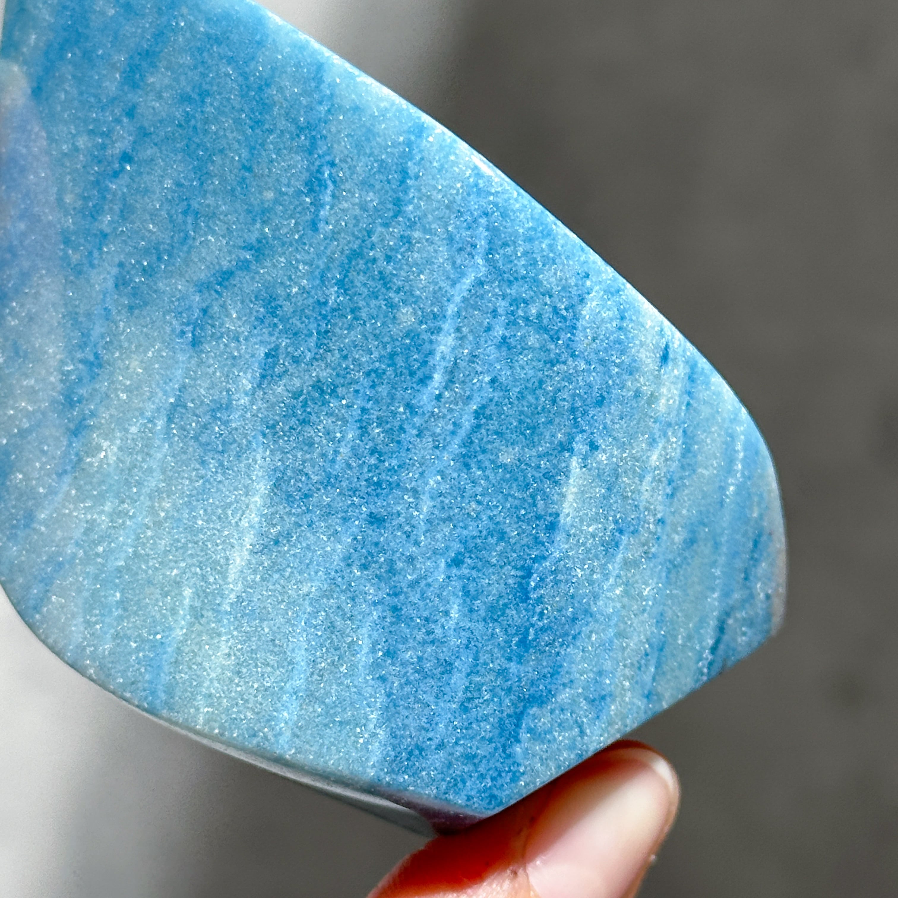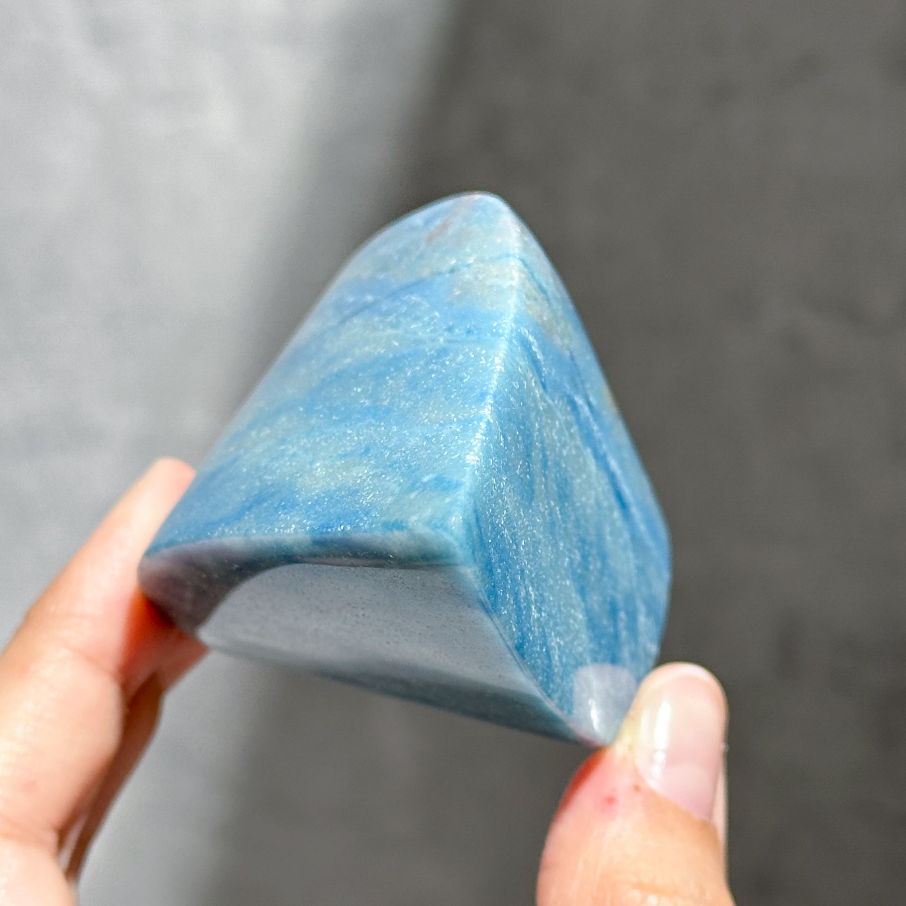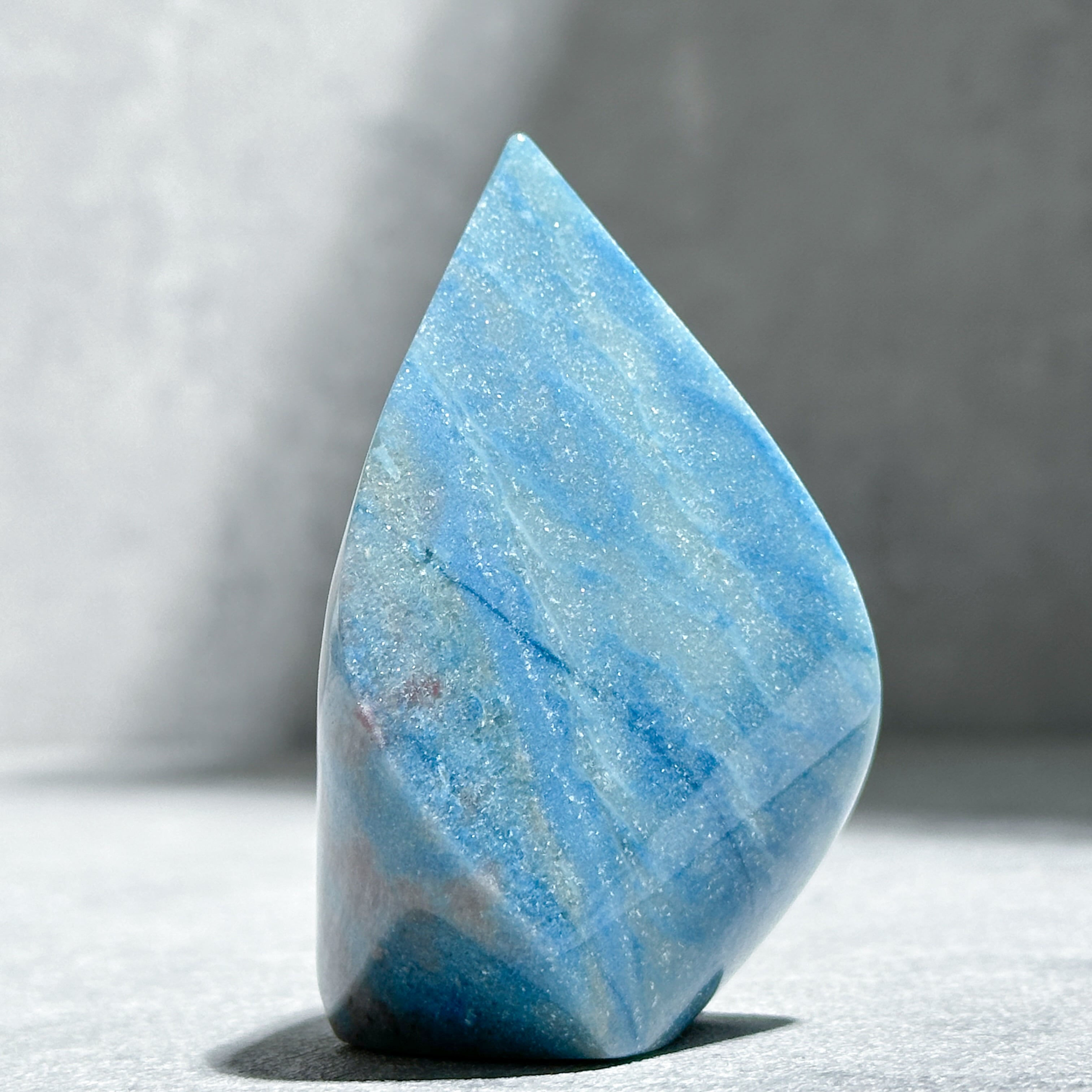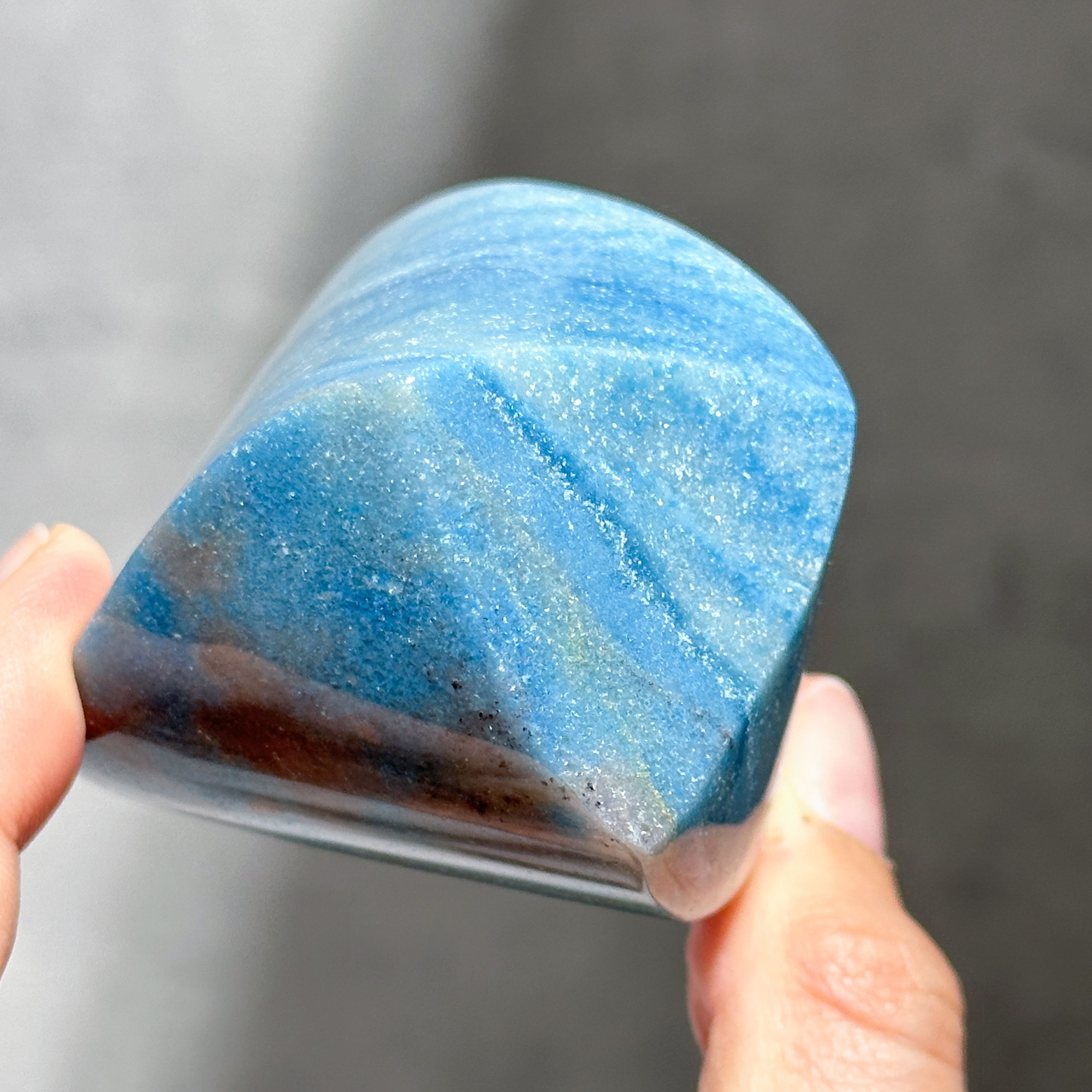 ここでは「トロレアイト」と呼びますが、トロレアイト(青)・クォーツ(白)・ラズライト(濃い青)が混じったもののようで、曲線を描くグラデーションと引き込まれるような色合いを持つ鉱物です。面によって異なる表情を見せる、世界に二つとないお品です。