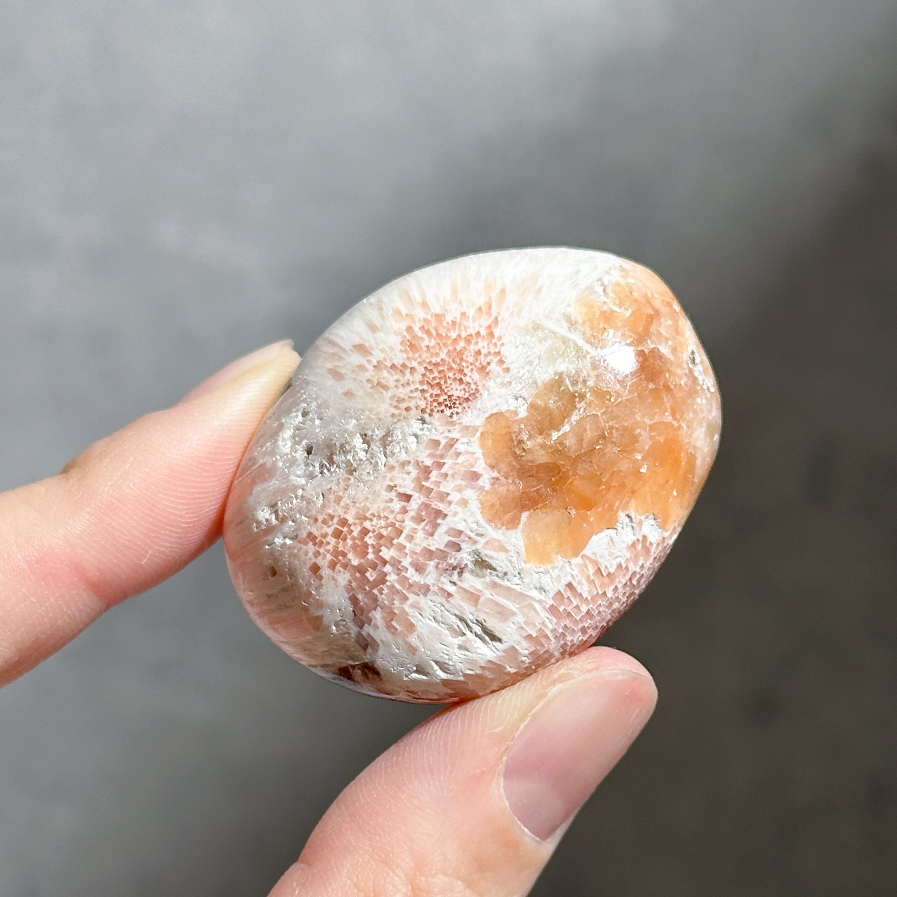 繊細なスコレサイトを滑らかなパームに研磨した、稀少なピンクスコレサイト。