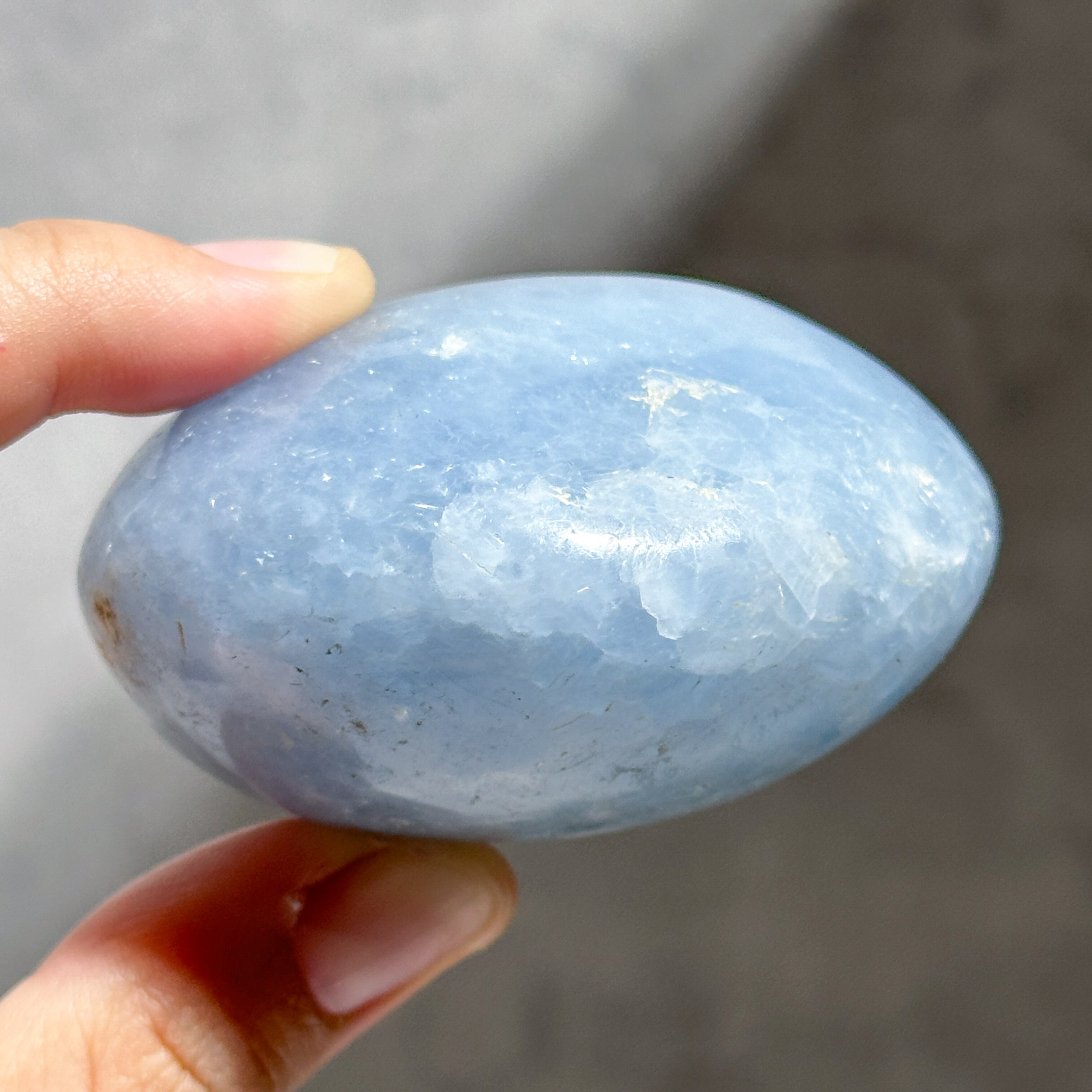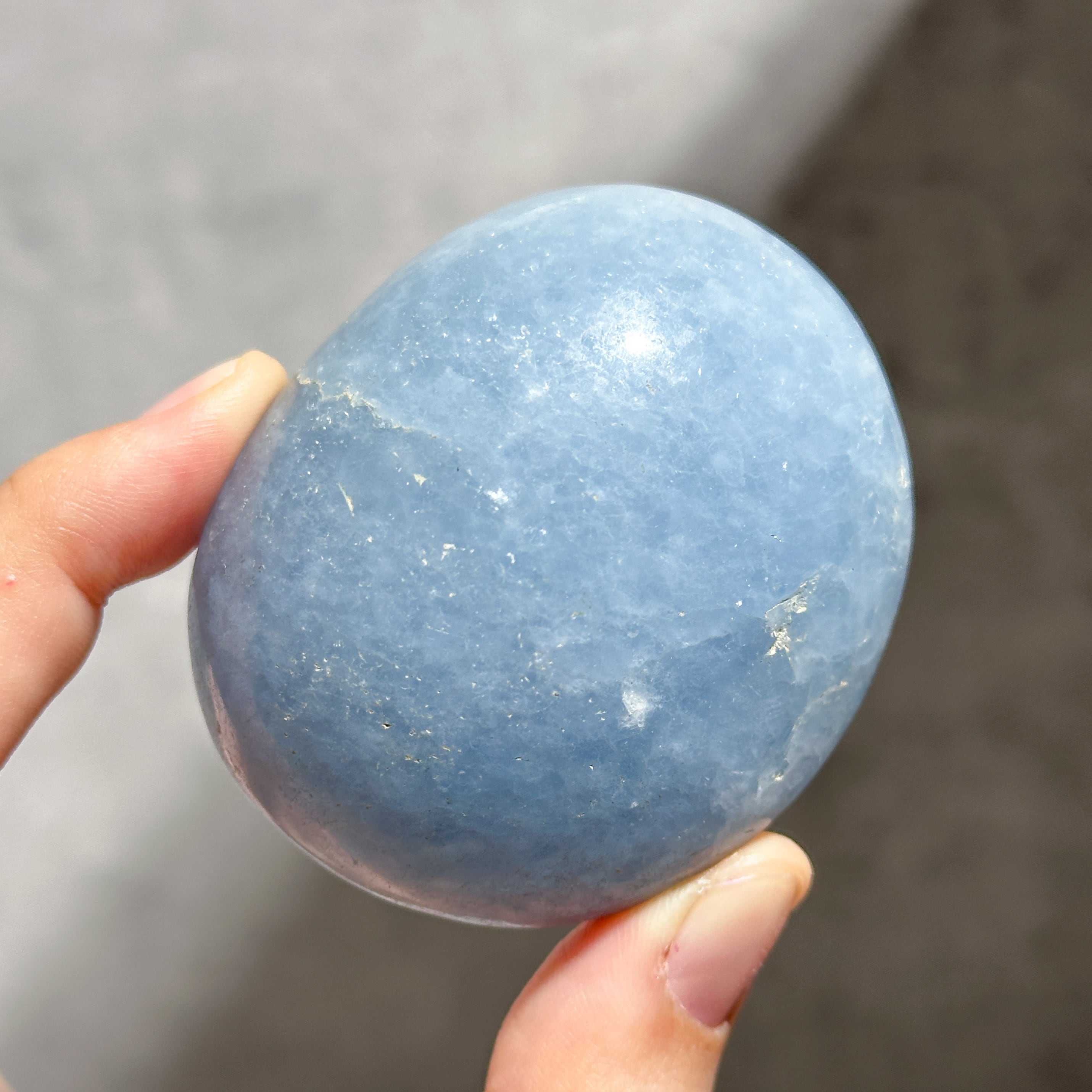 澄み渡るライトブルーのセレスタイトをころんと可愛いパームストーン(握り石)に研磨しました。