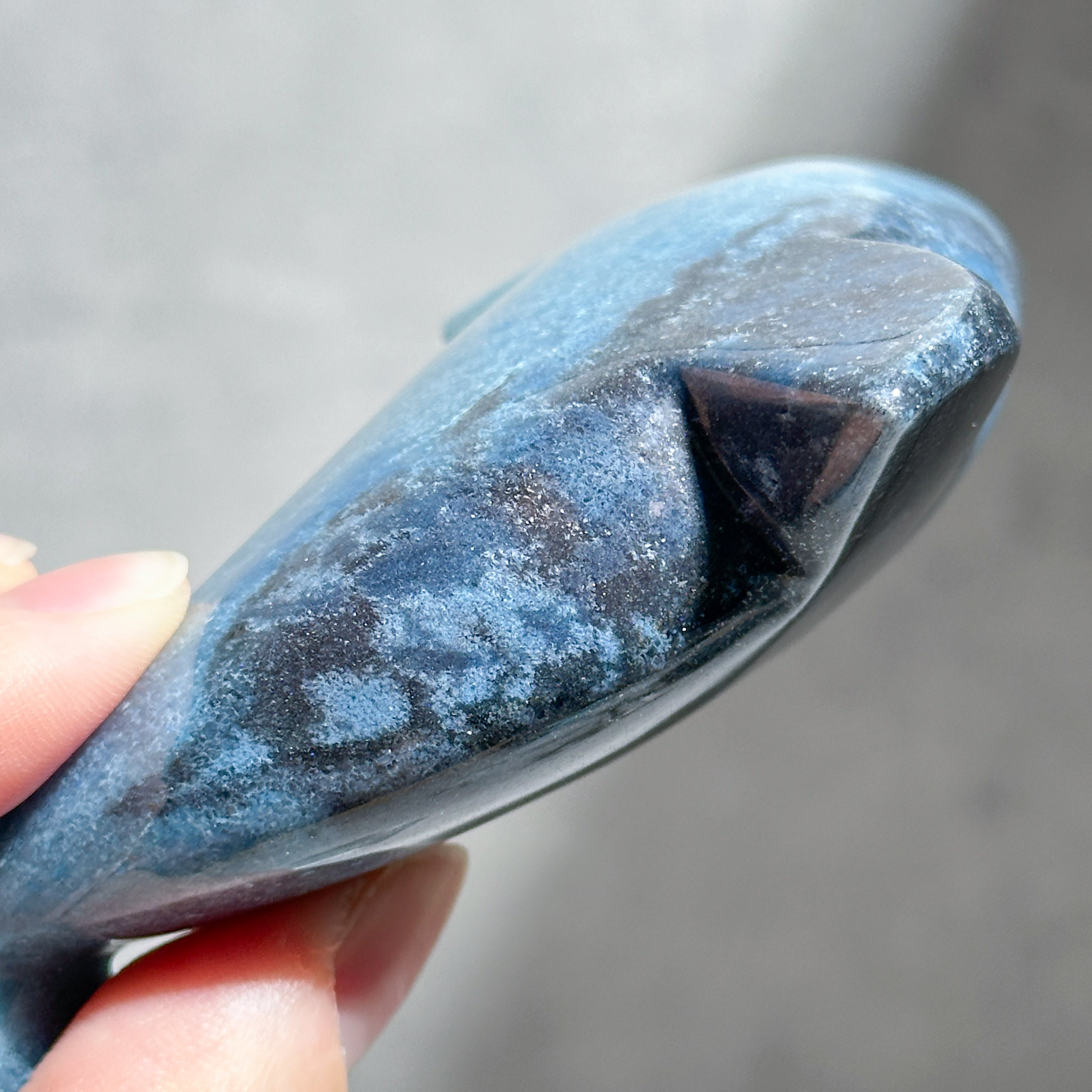 ここでは「トロレアイト」と呼びますが、トロレアイト(青)・クォーツ(白)・ラズライト(濃い青)が混じったもののようで、曲線を描くグラデーションと引き込まれるような色合いを持つ鉱石です。面によって異なる表情を見せる、世界に二つとないお品です。
