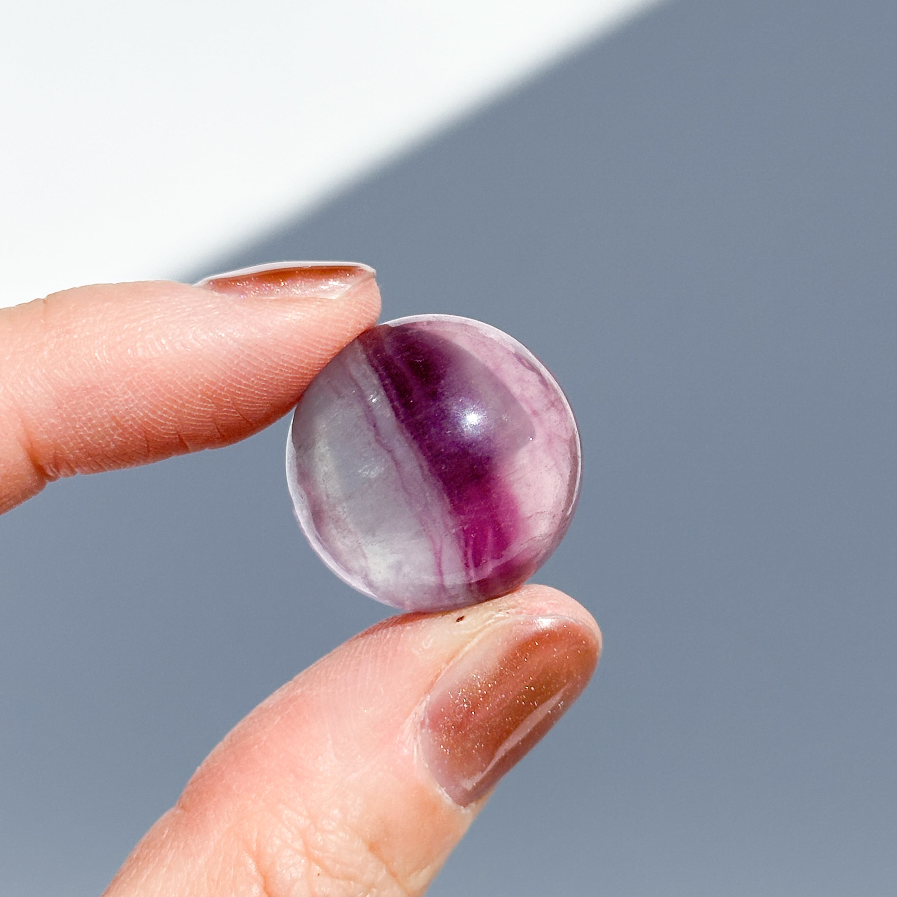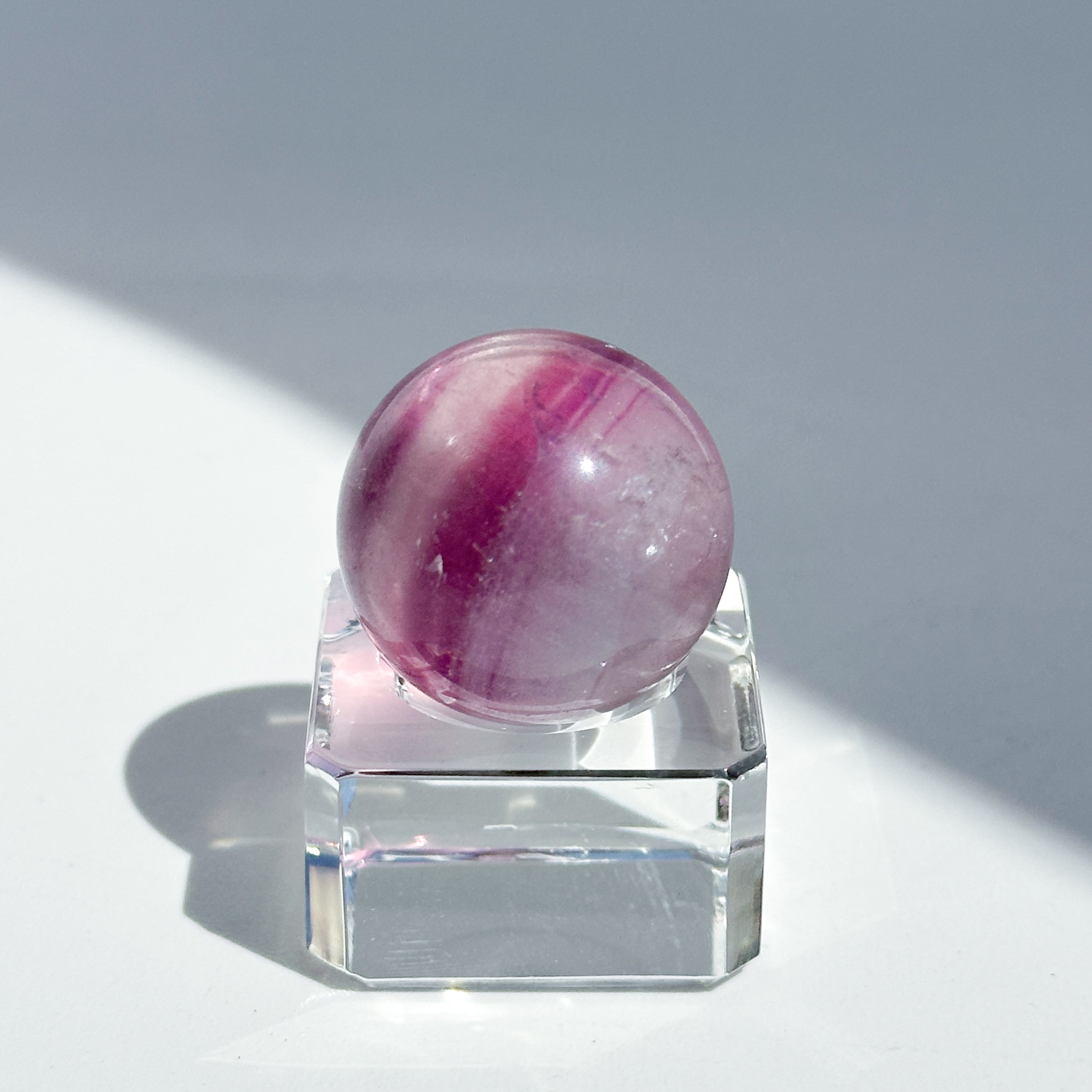 レインボーフローライトは複数のカラー(透明・パープル・ブルー・ピンク・グリーン)が共生し、水面のような曲線の模様を生み出しています。