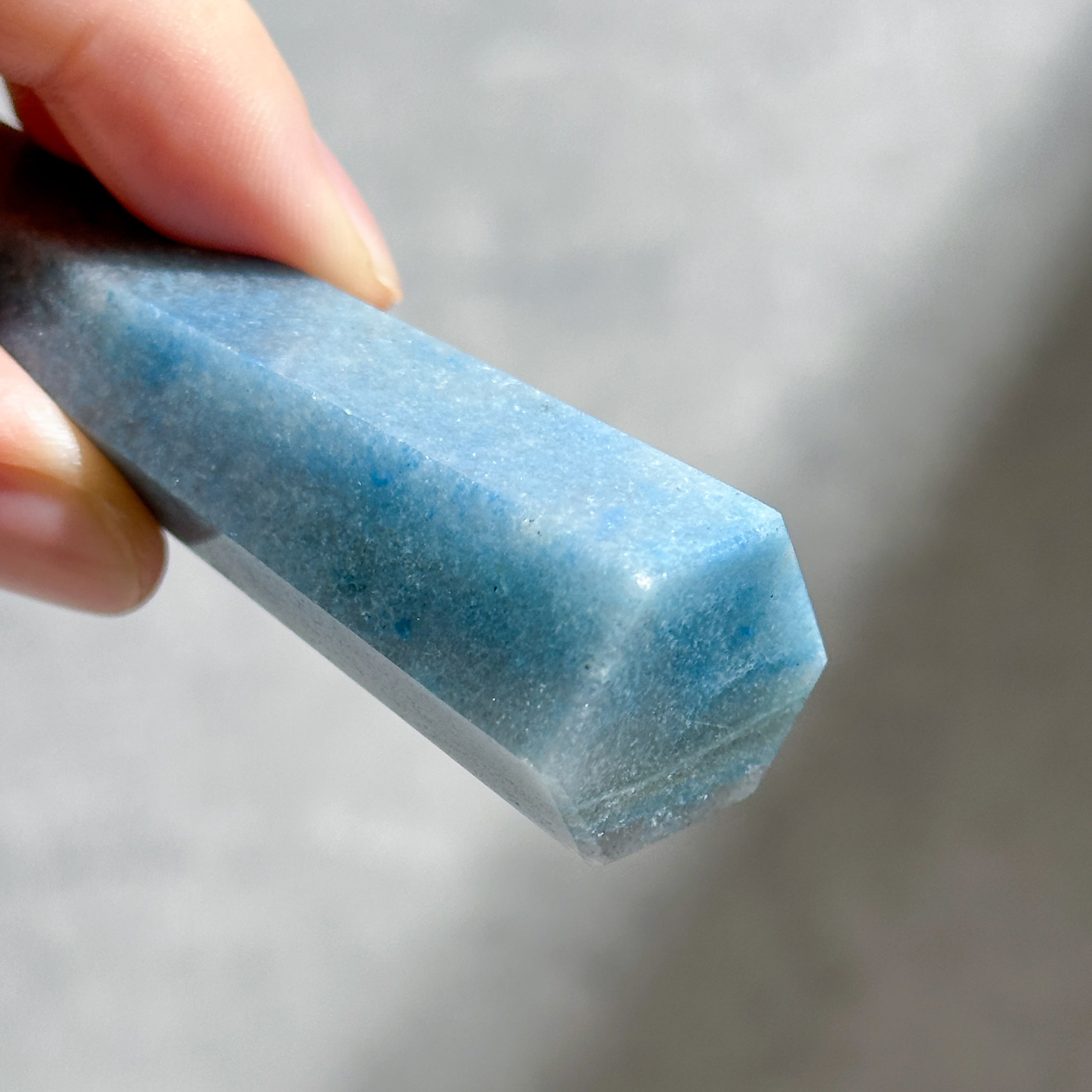 ここでは「トロレアイト」と呼びますが、トロレアイト(青)・クォーツ(白)・ラズライト(濃い青)が混じったもののようで、曲線を描くグラデーションと引き込まれるような色合いを持つ鉱物です。面によって異なる表情を見せる、世界に二つとないお品です。