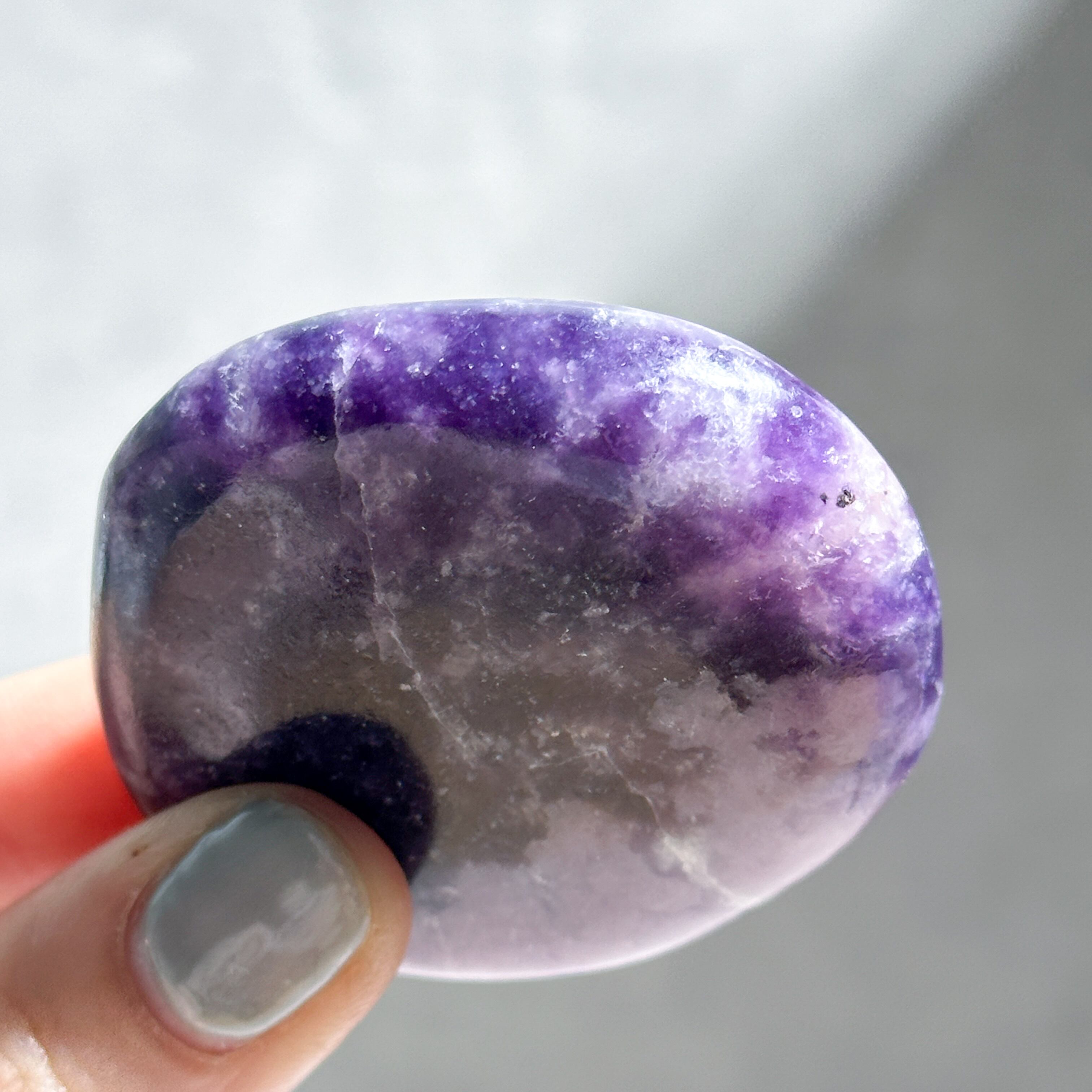 パープル色の鉱石、レピドライトの原石をパーム型に研磨しました。