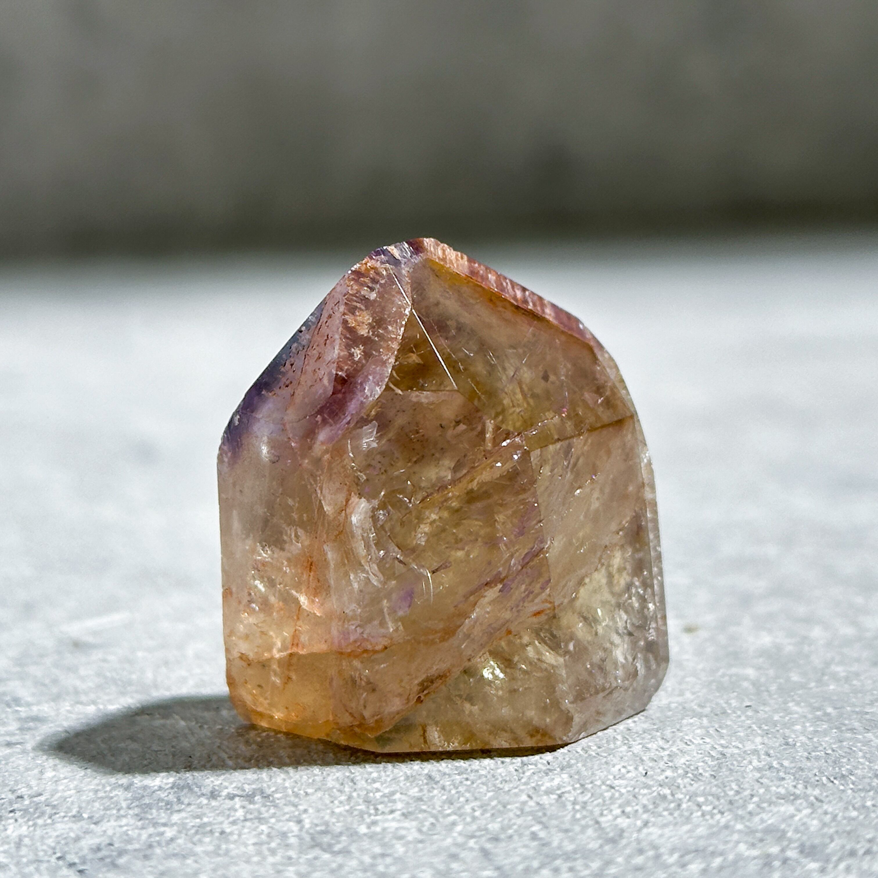 オレンジに色付いた部分は、水晶の表面にヘマタイトなどの鉄分を含んだタンジェリンクォーツと呼ばれるもので、トップにはアメジストが帽子のようにコーティングされています。