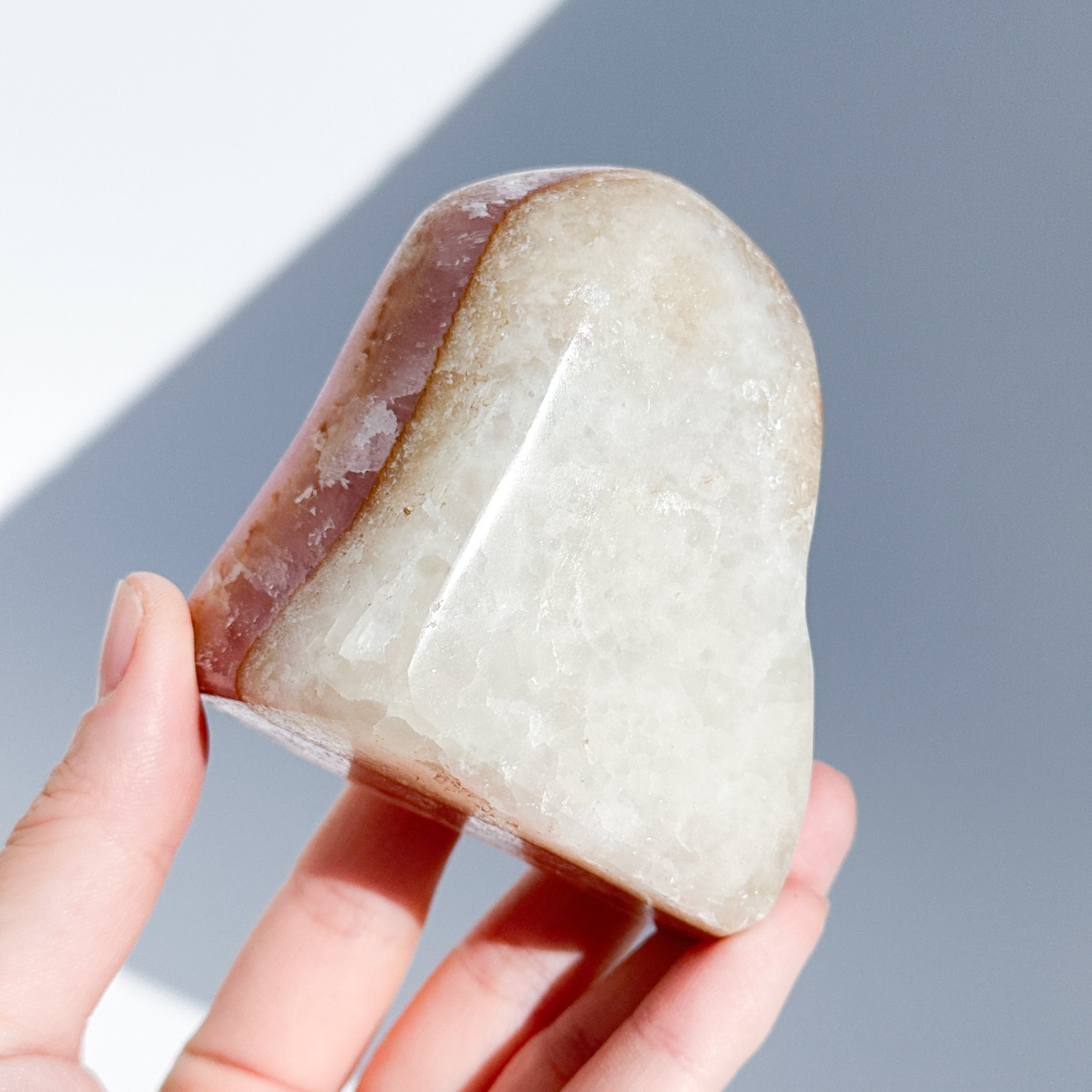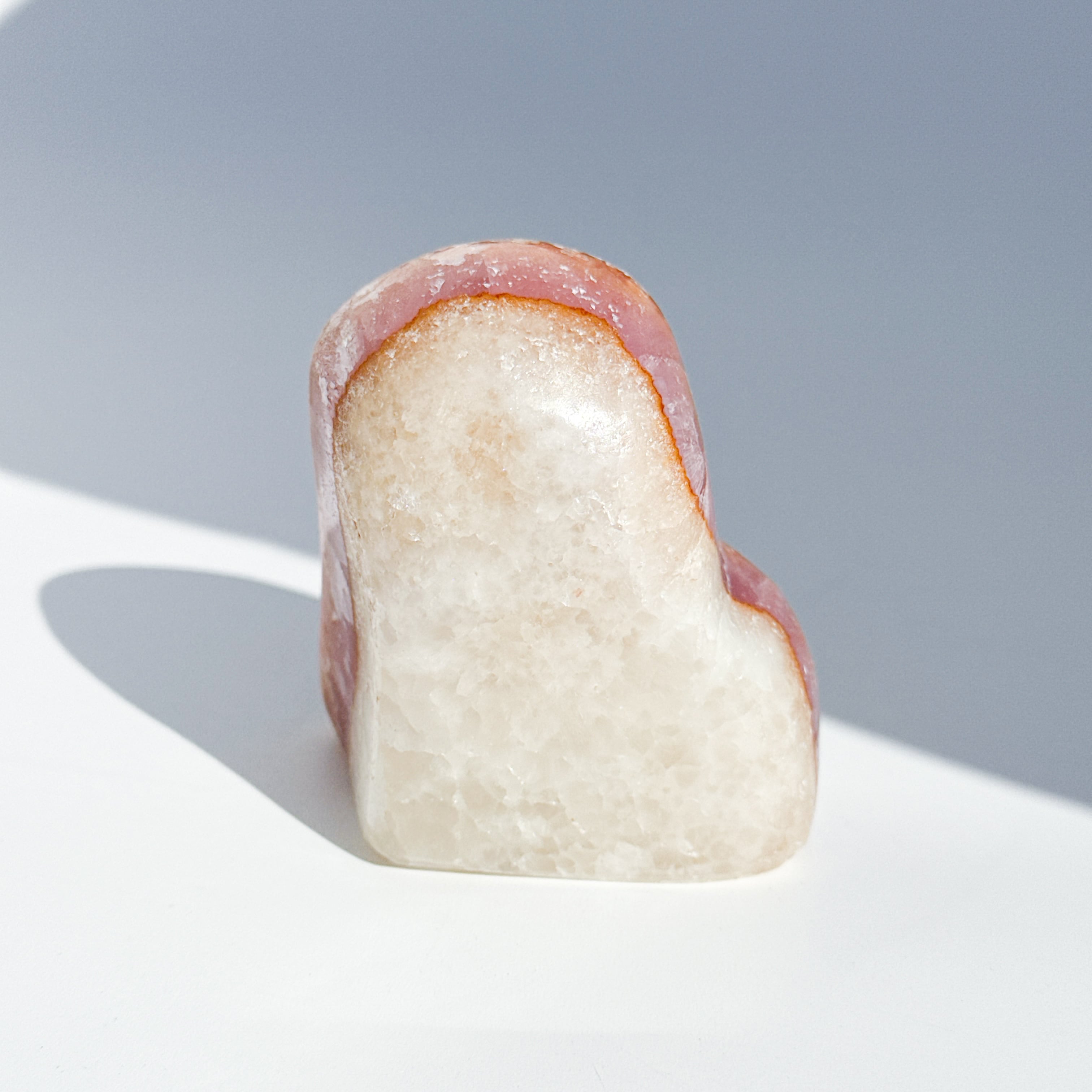 白色の部分も同じアラゴナイトです。アラゴナイト自体は世界中で産出する石ですが、このように、白とピンクが混じったものは、他に類を見ない非常に珍しいものです✧